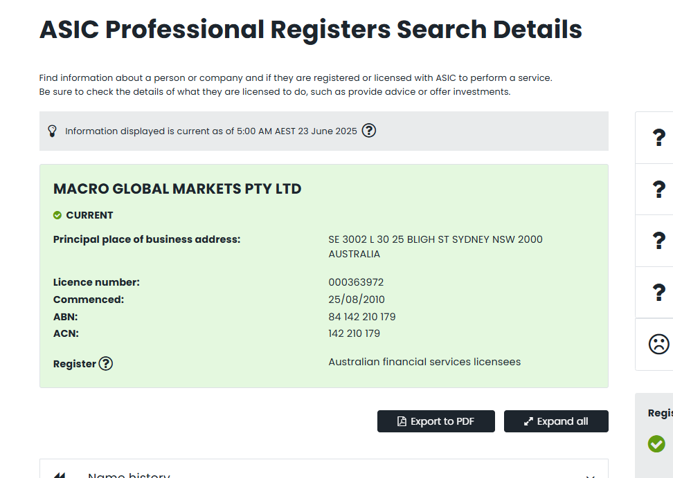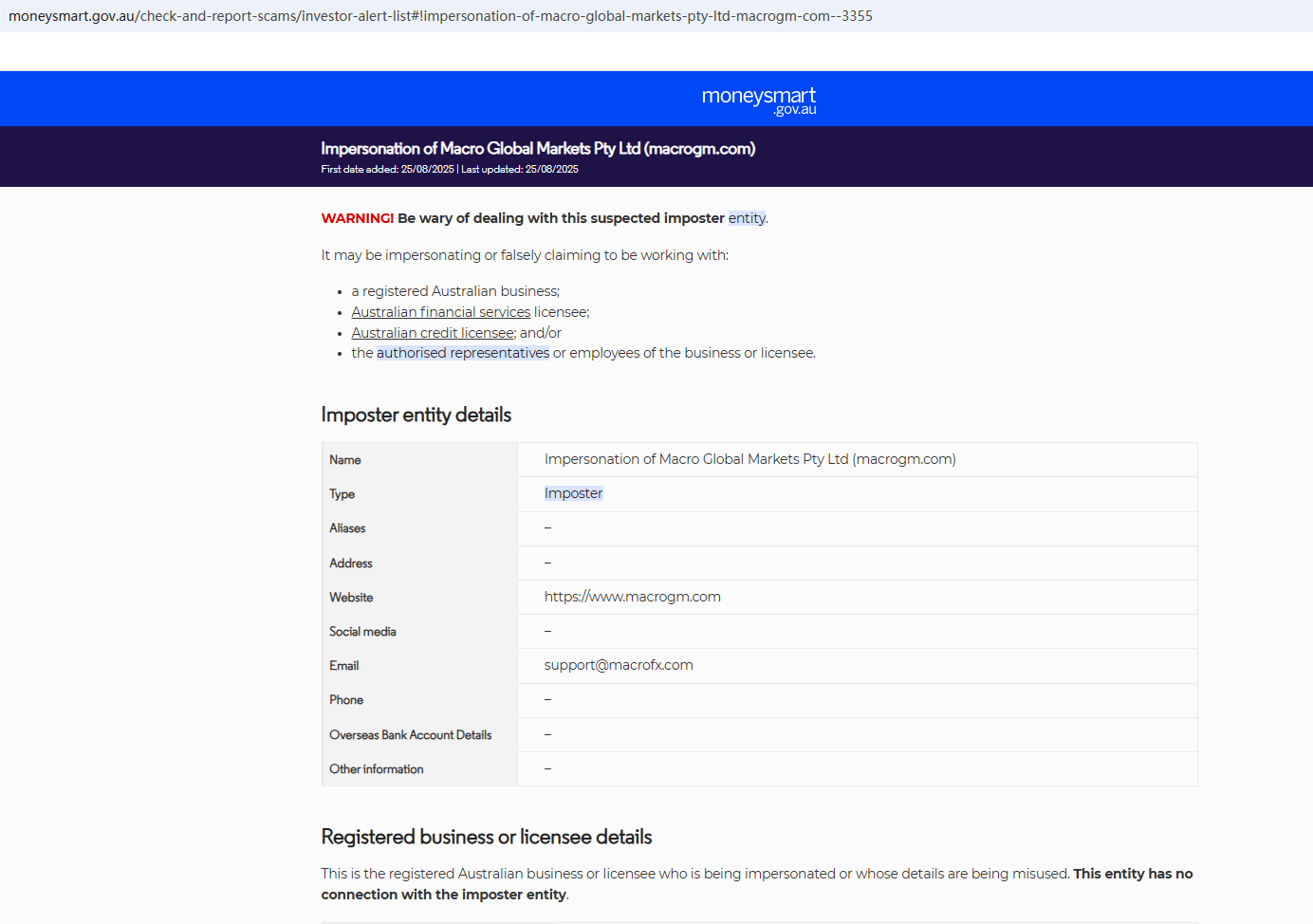 เมื่อวันที่ 25 สิงหาคม 2568 สำนักงานคณะกรรมการกำกับหลักทรัพย์และการลงทุนออสเตรเลีย (ASIC) ได้ออกคำเตือนต่อ Macro Global Markets โดยเชื่อว่าบริษัทนี้อาจให้บริการหรือผลิตภัณฑ์ทางการเงินโดยไม่ได้รับอนุญาตอย่างถูกต้องhttps://moneysmart.gov.au/check-and-report-scams/investor-alert-list#!impersonation-of-macro-global-markets-pty-ltd-macrogm-com--3355