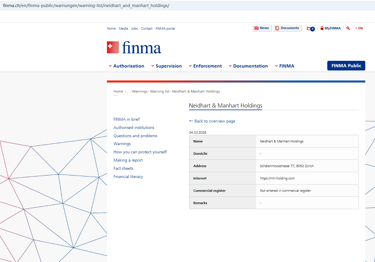 เมื่อวันที่ 27 กุมภาพันธ์ 2569 หน่วยงานกำกับดูแลตลาดการเงินของสวิตเซอร์แลนด์ (FINMA) ได้ออกคำเตือนต่อบริษัท Neidhart & Manhart Holdings โดยระบุว่าโบรกเกอร์รายนี้ไม่ได้จดทะเบียนในทะเบียนการค้าของ FINMA https://www.finma.ch/en/finma-public/warnungen/warning-list/neidhart_and_manhart_holdings/