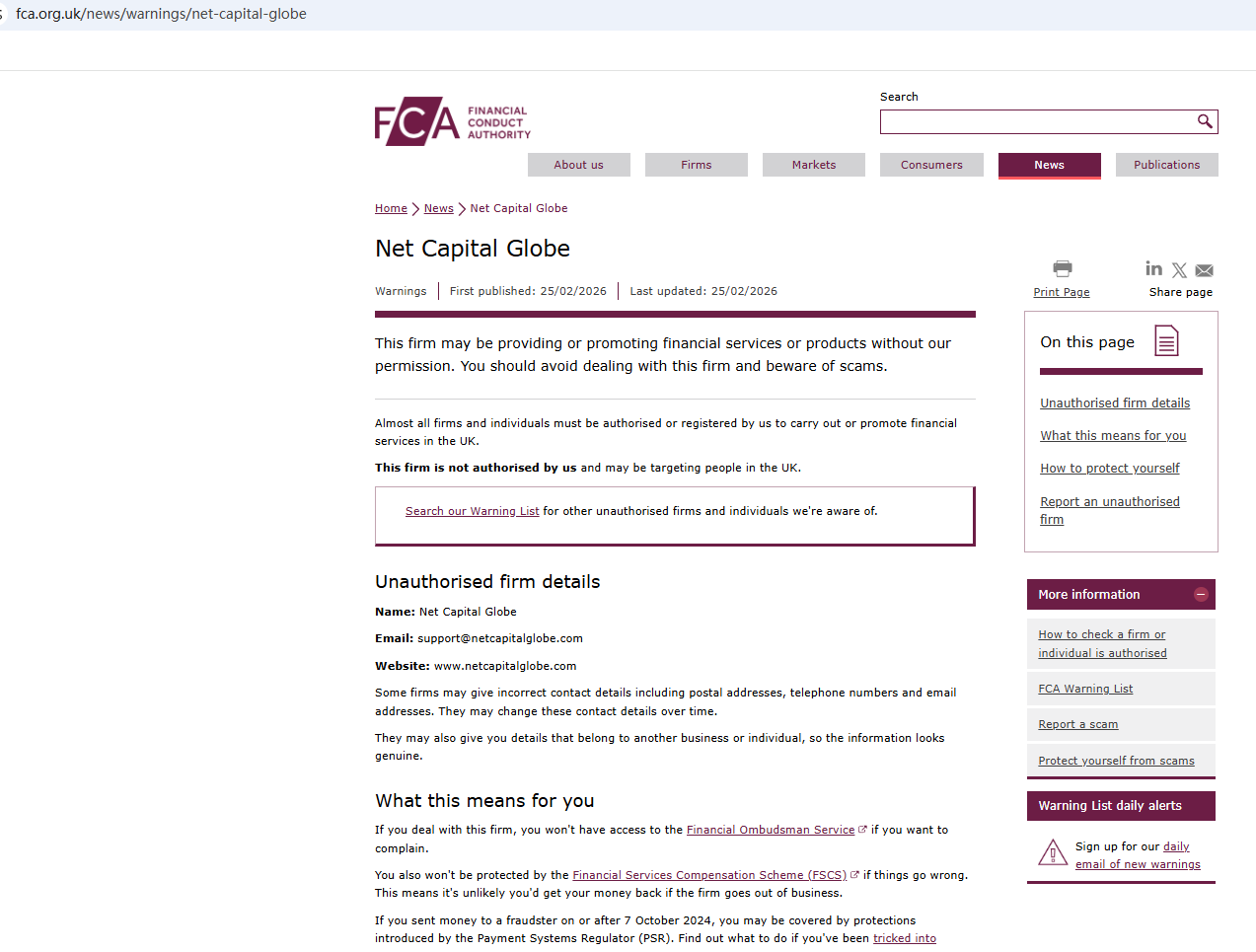 เมื่อวันที่ 25 กุมภาพันธ์ 2569 หน่วยงานกำกับดูแลด้านการเงิน (FCA) ได้ออกคำเตือนเกี่ยวกับบริษัท Net Capital Globe โดยสงสัยว่าบริษัทนี้อาจให้บริการหรือผลิตภัณฑ์ทางการเงินโดยไม่ได้รับอนุญาตอย่างถูกต้องhttps://www.fca.org.uk/news/warnings/net-capital-globe