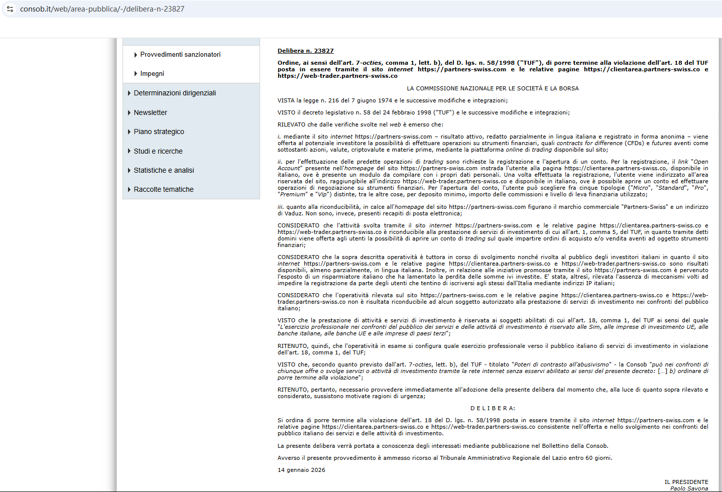 เมื่อวันที่ 14 มกราคม 2569 คณะกรรมการบริษัทและตลาดหลักทรัพย์ของอิตาลี (CONSOB) ได้สั่งขึ้นบัญชีดำบริษัท Partners Swiss เนื่องจากให้บริการทางการเงินอย่างผิดกฎหมายในอิตาลีhttps://www.consob.it/web/area-pubblica/-/delibera-n-23827