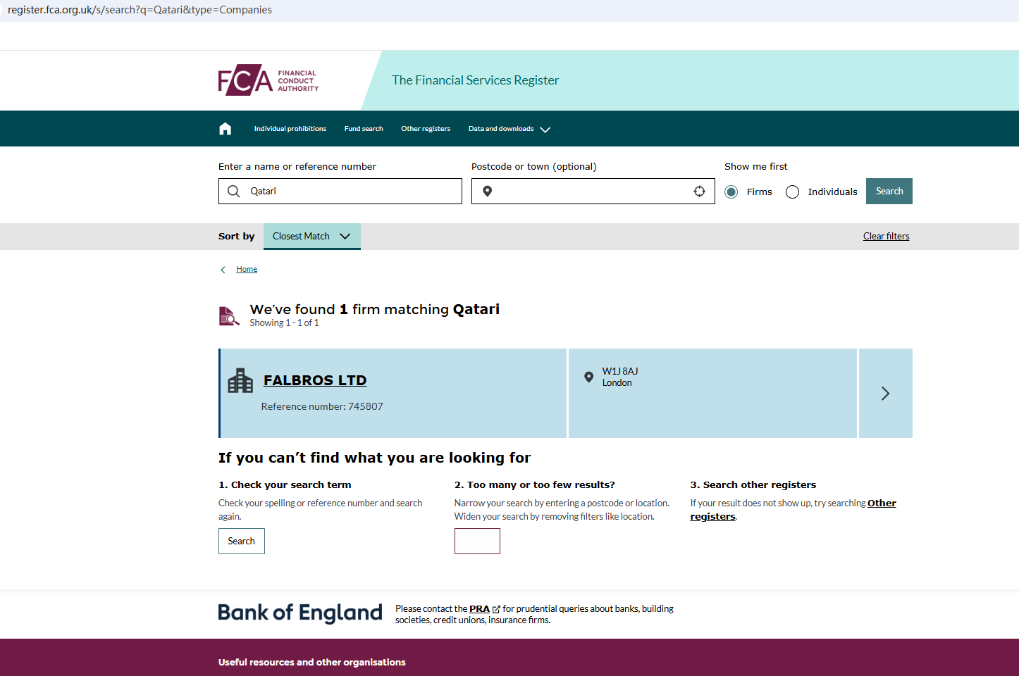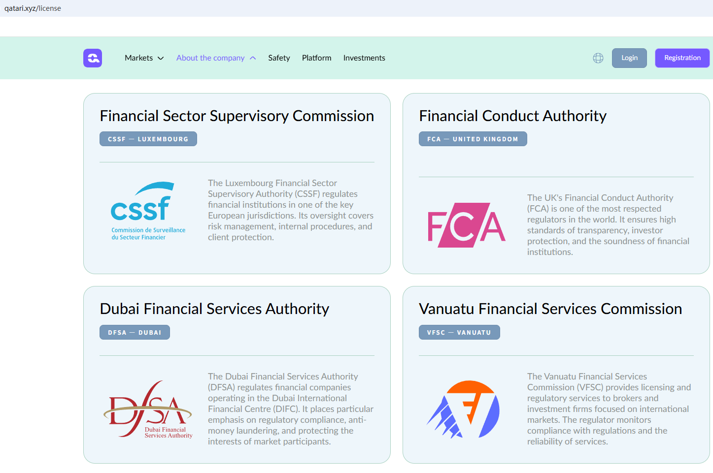 ตามข้อมูลบนเว็บไซต์ บริษัทอ้างว่าได้รับการกำกับดูแลจากหลายหน่วยงาน อย่างไรก็ตาม เมื่อตรวจสอบแล้ว ไม่พบข้อมูลที่ตรงกันในหน่วยงานกำกับดูแลทางการเงิน (FCA) หน่วยงานกำกับดูแลบริการทางการเงินของดูไบ (DFSA) และ คณะกรรมการบริการทางการเงินของวานูอาตู (VFSC) นอกจากนี้ คณะกรรมการกำกับดูแลภาคการเงิน (CSSF) ยังได้ออกคำเตือนเกี่ยวกับ Qatari โดยสงสัยว่าบริษัทนี้อาจให้บริการทางการเงินหรือผลิตภัณฑ์โดยไม่ได้รับอนุญาตอย่างถูกต้อง