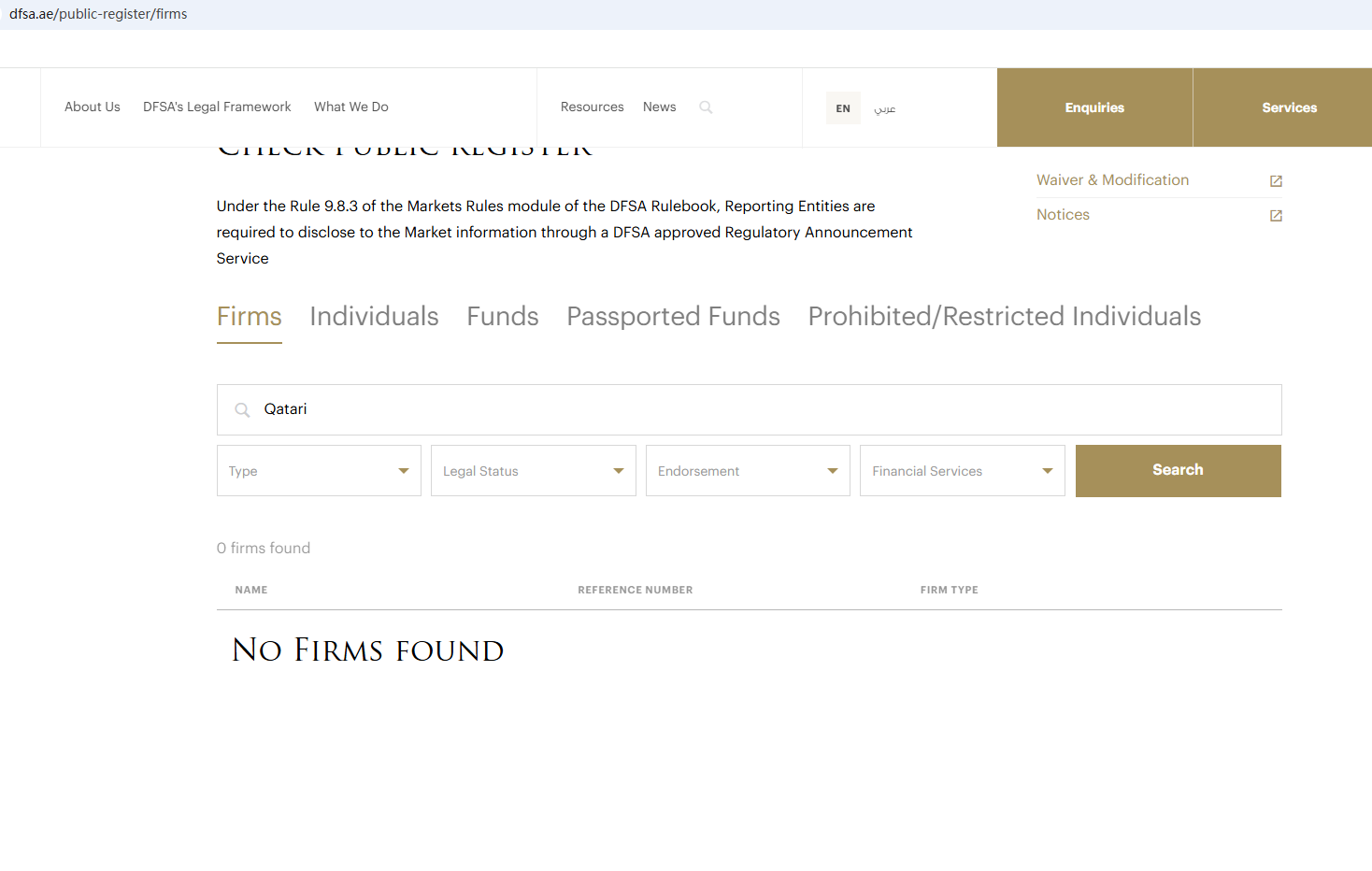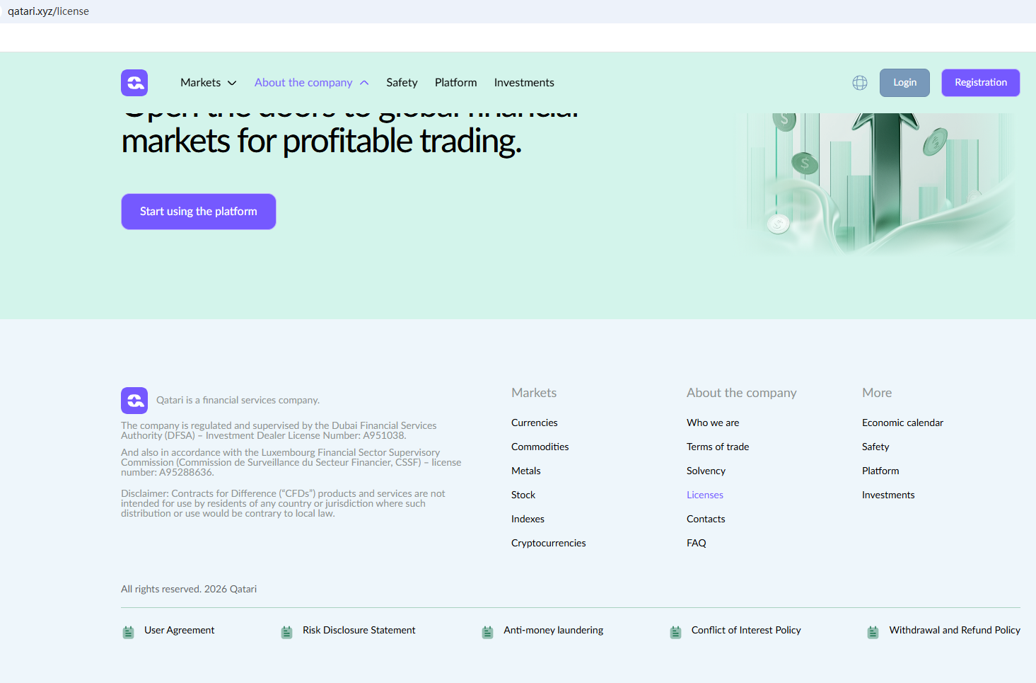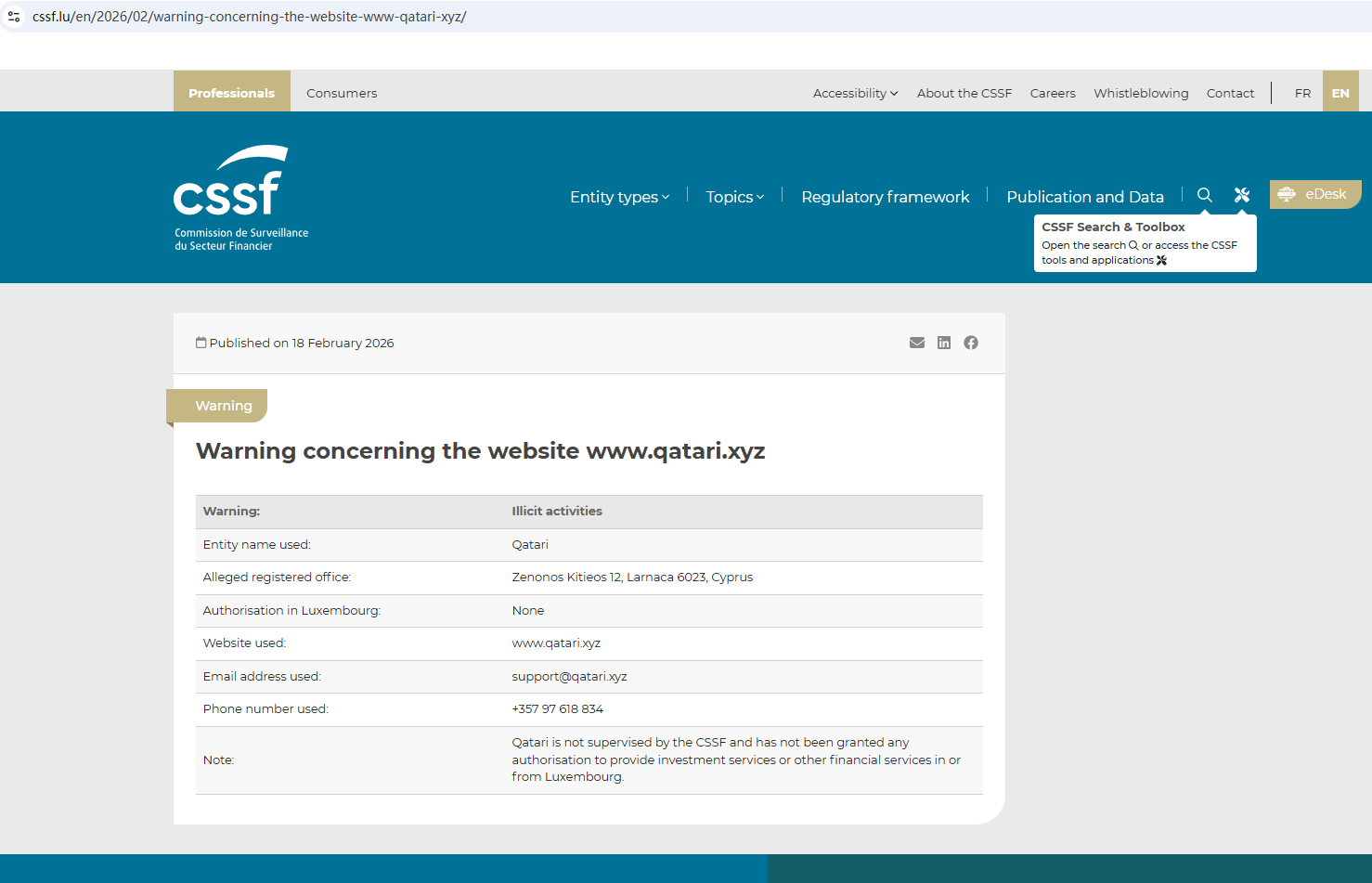 เมื่อวันที่ 18 กุมภาพันธ์ 2569 คณะกรรมการกำกับดูแลภาคการเงิน (CSSF) ได้ออกคำเตือนเกี่ยวกับบริษัท Qatari โดยสงสัยว่าบริษัทนี้อาจให้บริการหรือผลิตภัณฑ์ทางการเงินโดยไม่ได้รับอนุญาตอย่างถูกต้องhttps://www.cssf.lu/en/2026/02/warning-concerning-the-website-www-qatari-xyz/