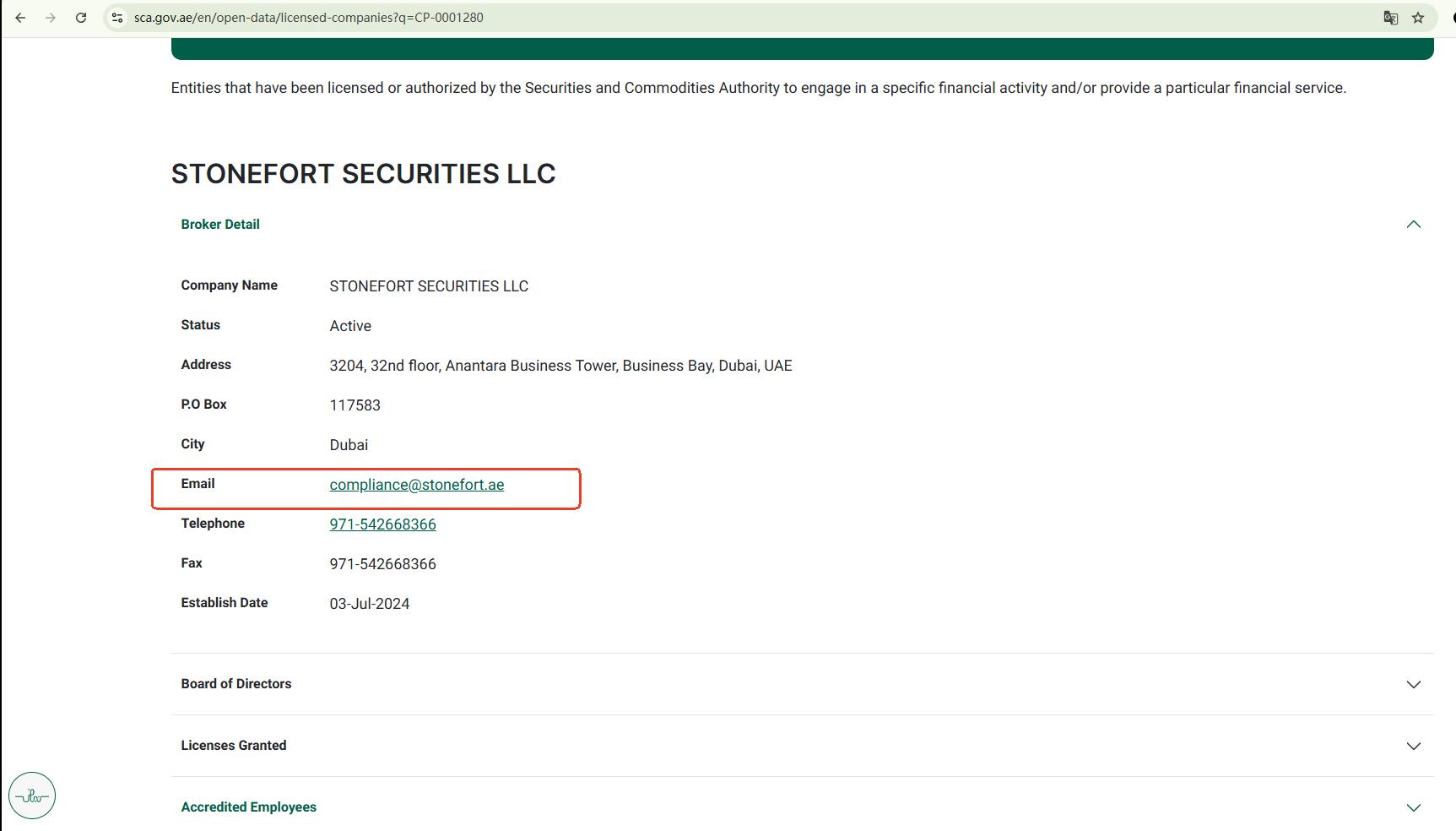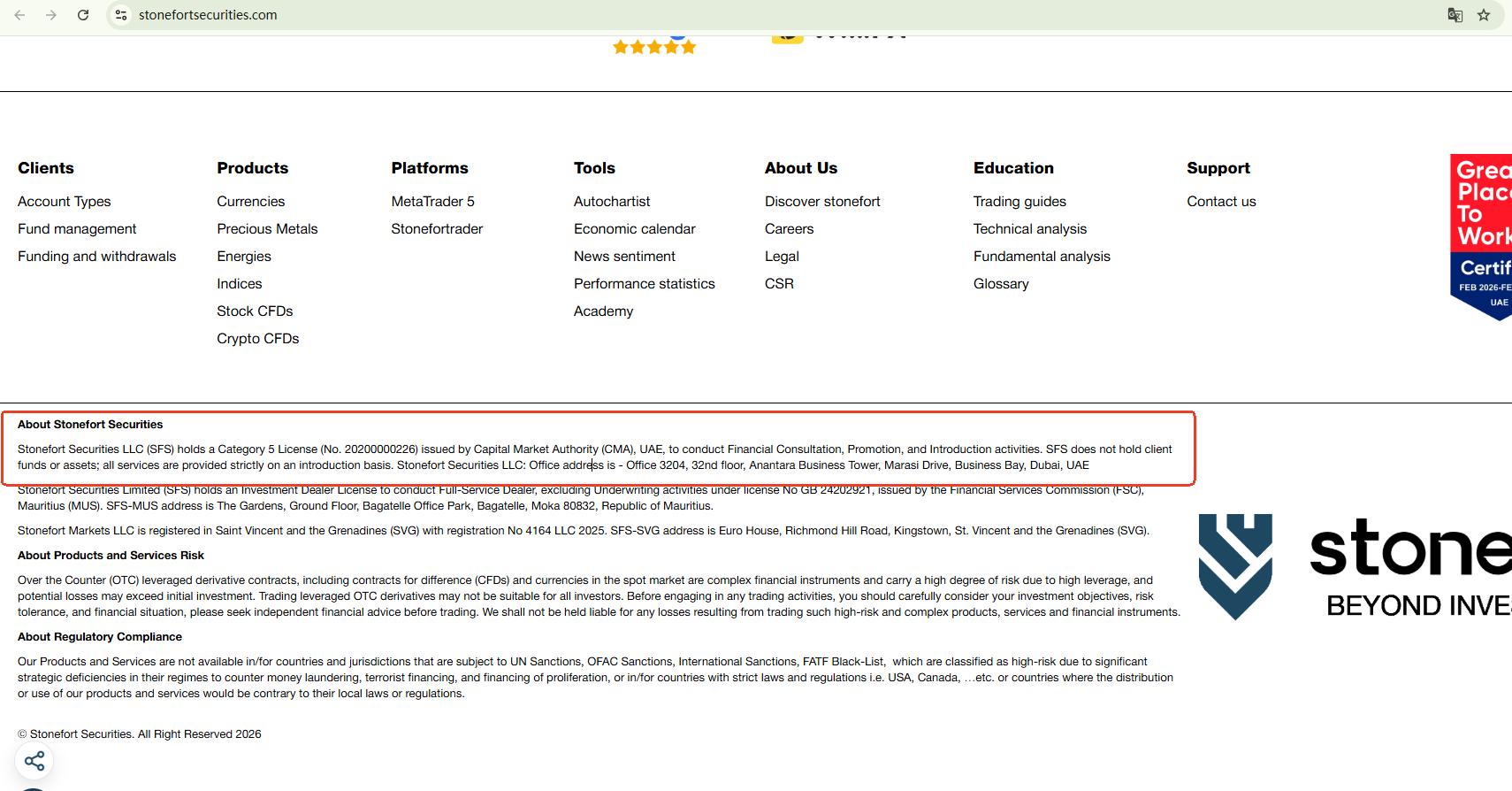Upon investigation, we confirmed that while a company with this name is indeed registered with the UAE CMA, the domain name officially associated with that licensed entity does not match the website of the Stonefort platform you are consulting. The platform in question appears to be impersonating the legitimate firm by cloning its name, logo, and identity to falsely present itself as a compliant, regulated broker.
