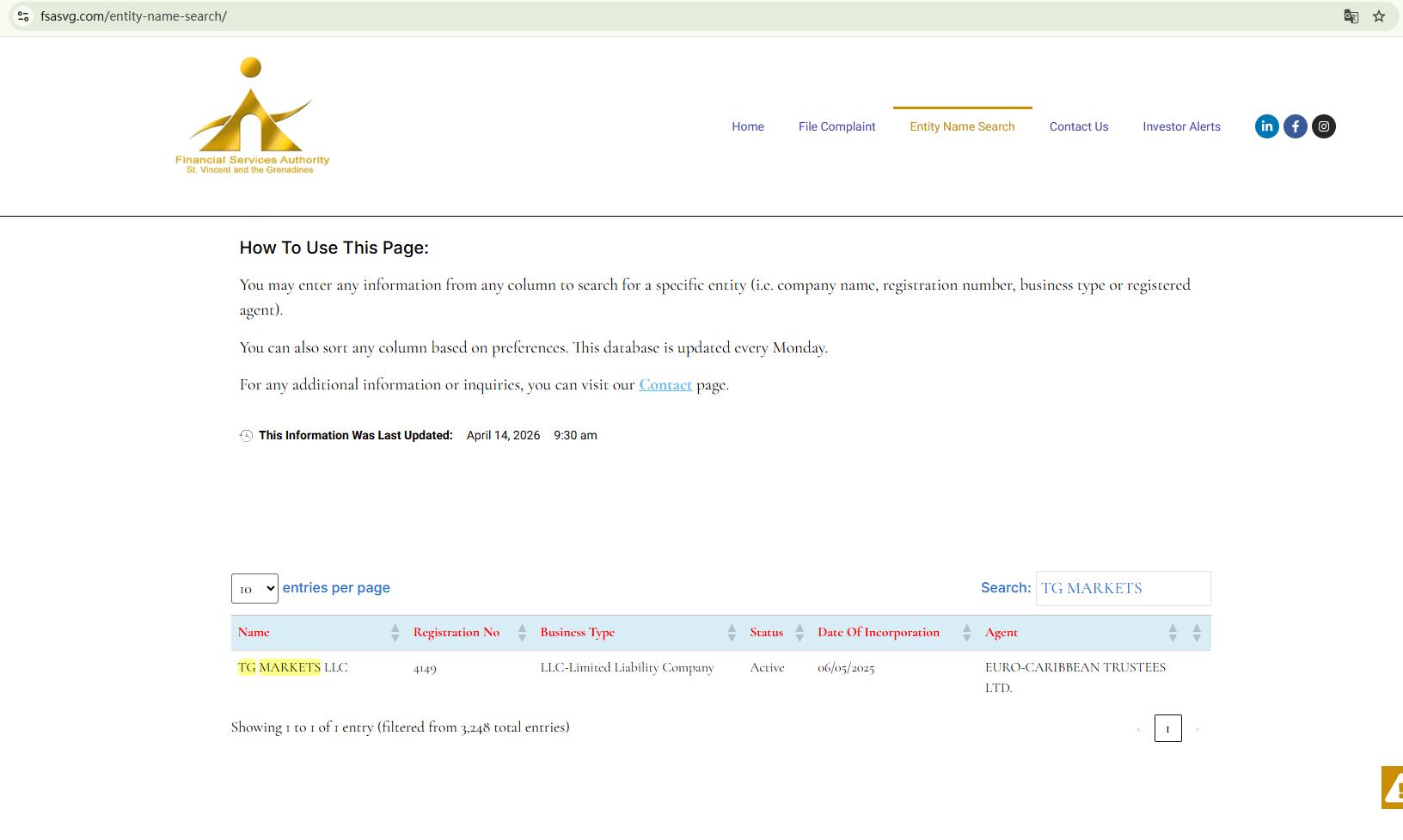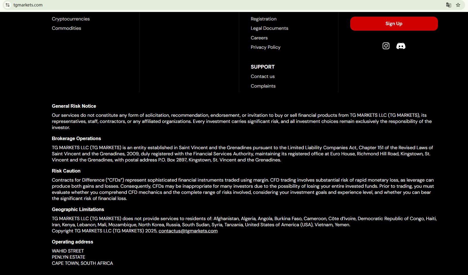 TG Markets อ้างบนเว็บไซต์ของตนว่าจดทะเบียนในเซนต์วินเซนต์และเกรนาดีนส์เท่านั้น แม้ว่าเราจะพบข้อมูลบริษัทที่ตรงกันในทะเบียนของหน่วยงานกำกับดูแลบริการทางการเงิน (FSA) ของเซนต์วินเซนต์และเกรนาดีนส์ แต่การจดทะเบียนนี้ให้สถานะเพียงบริษัทธุรกิจระหว่างประเทศ (IBC) เท่านั้น ซึ่งไม่ถือเป็นใบอนุญาตทางการเงินที่ถูกต้อง FSA ของเซนต์วินเซนต์และเกรนาดีนส์ได้ระบุไว้อย่างชัดเจนว่าไม่ได้กำกับดูแลหรือออกใบอนุญาตให้กับโบรกเกอร์ฟอเร็กซ์