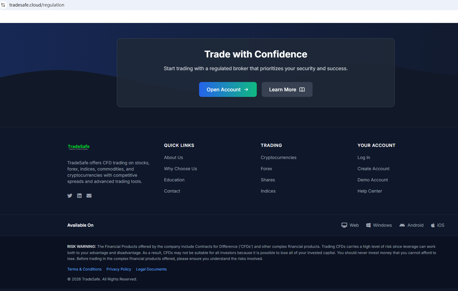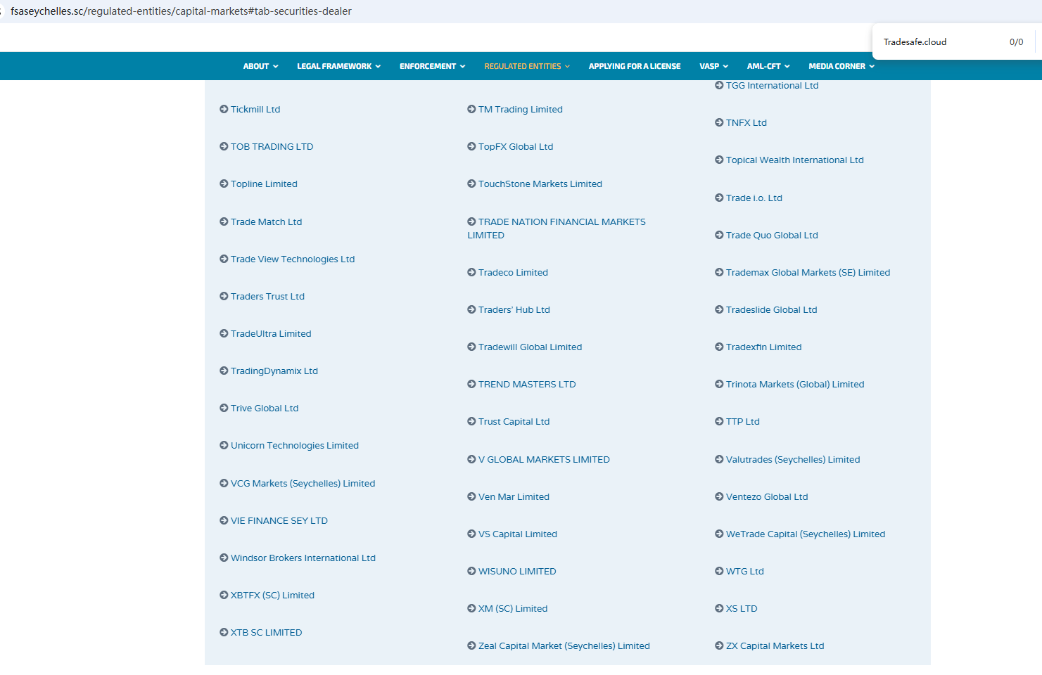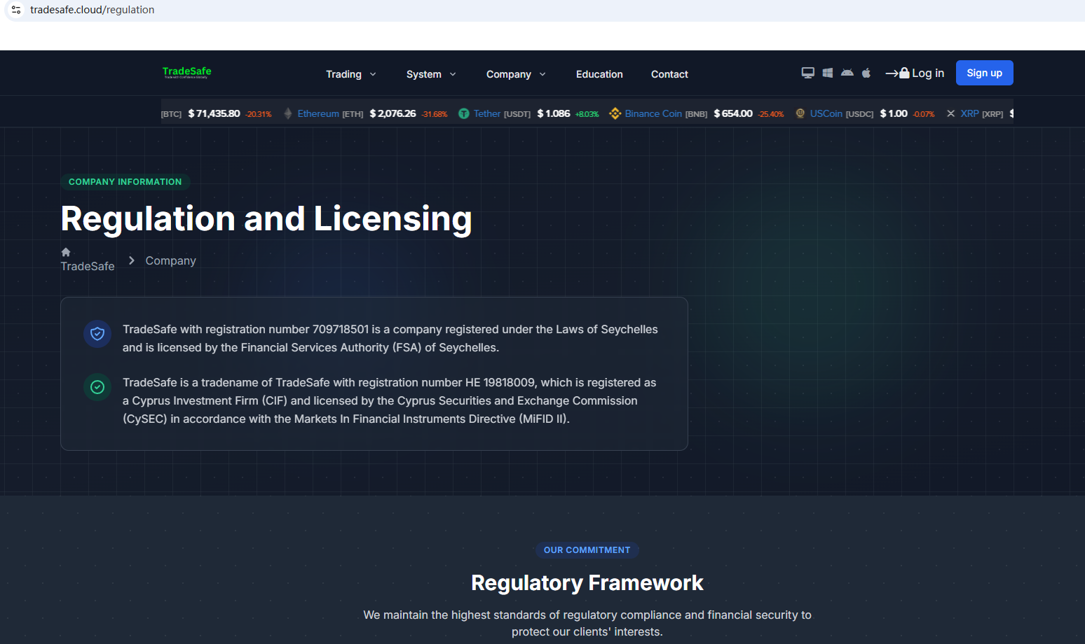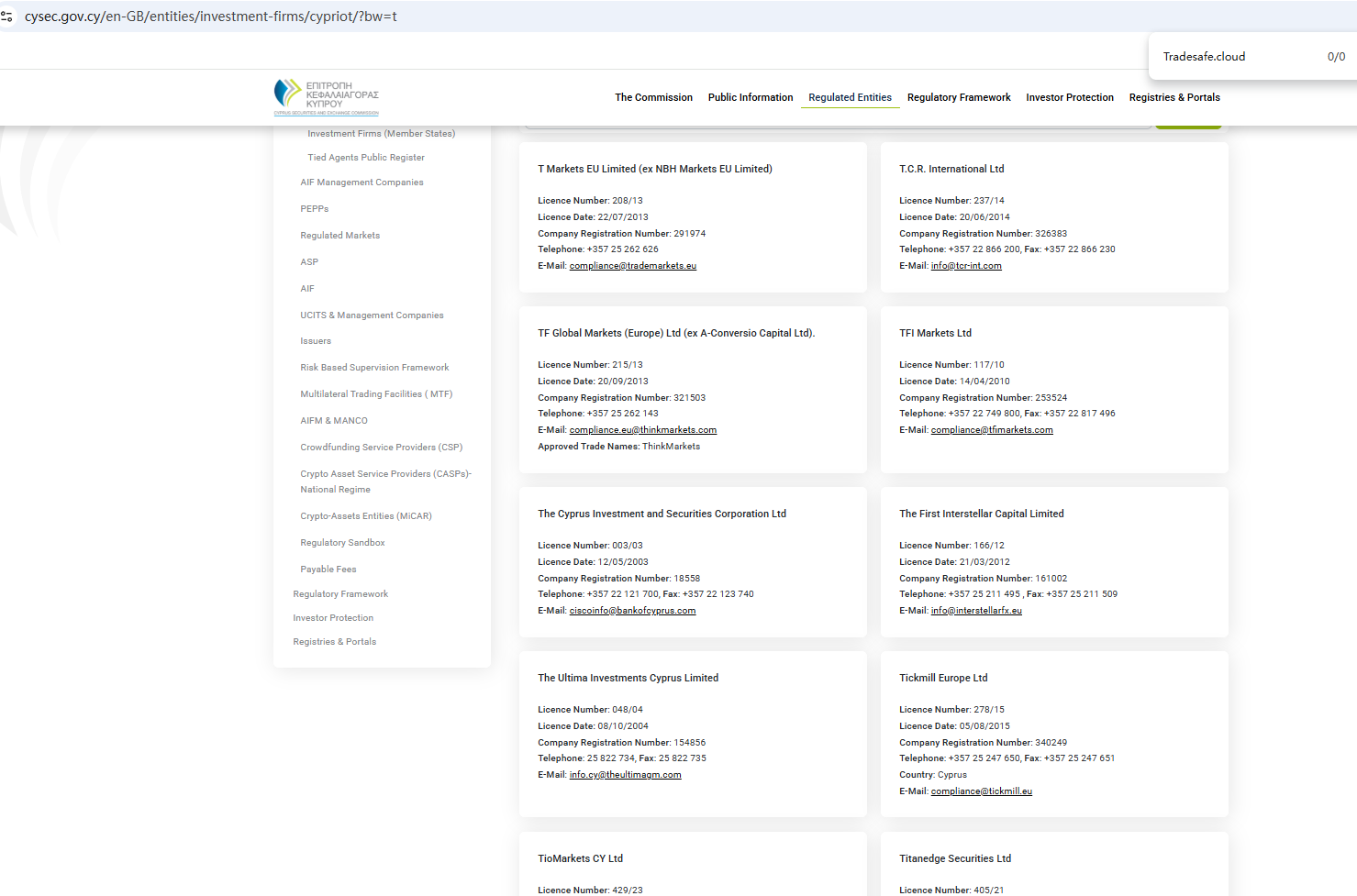 ตามข้อมูลบนเว็บไซต์ บริษัทอ้างว่าได้รับการกำกับดูแลโดยหน่วยงานกำกับดูแลบริการทางการเงินของเซเชลส์ (Seychelles FSA) และคณะกรรมการกำกับหลักทรัพย์และตลาดหลักทรัพย์ของไซปรัส (CySEC) อย่างไรก็ตาม จากการตรวจสอบไม่พบข้อมูลที่ตรงกันใน Seychelles FSA และ CySEC นอกจากนี้ หน่วยงานกำกับดูแลด้านการเงิน (FCA) ยังได้ออกคำเตือนเกี่ยวกับ Tradesafe.cloud โดยสงสัยว่าบริษัทนี้อาจให้บริการหรือผลิตภัณฑ์ทางการเงินโดยไม่ได้รับอนุญาตอย่างถูกต้อง
