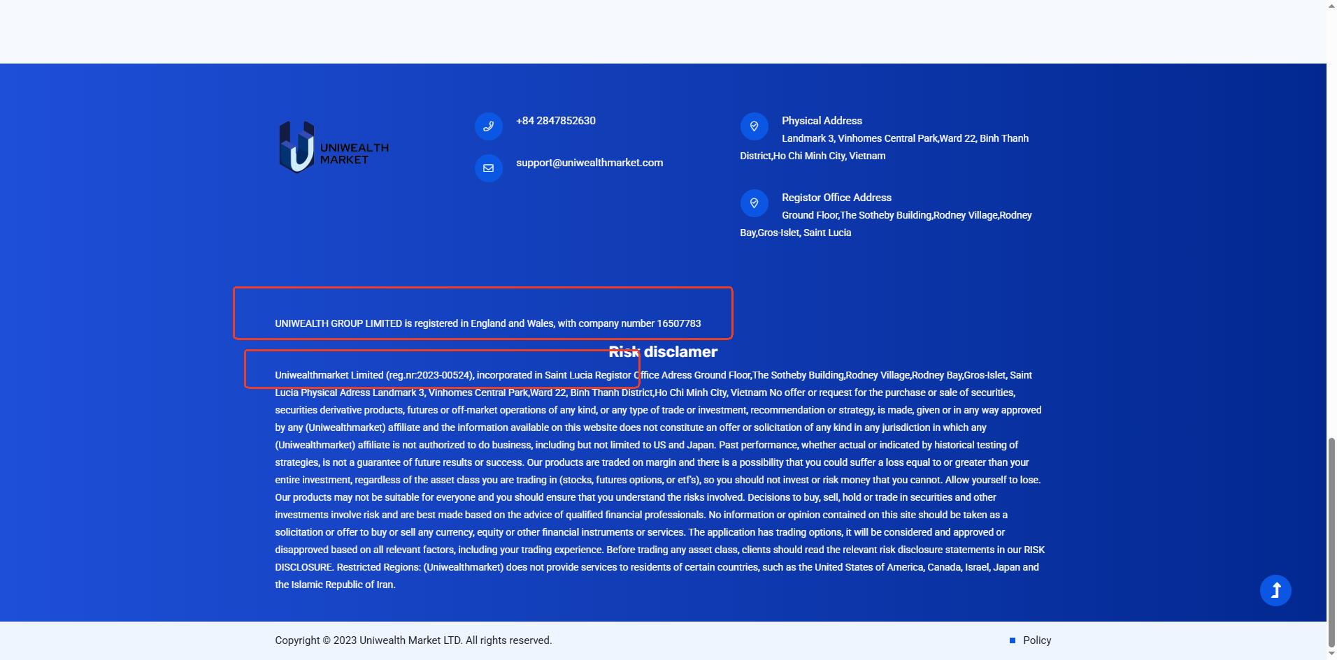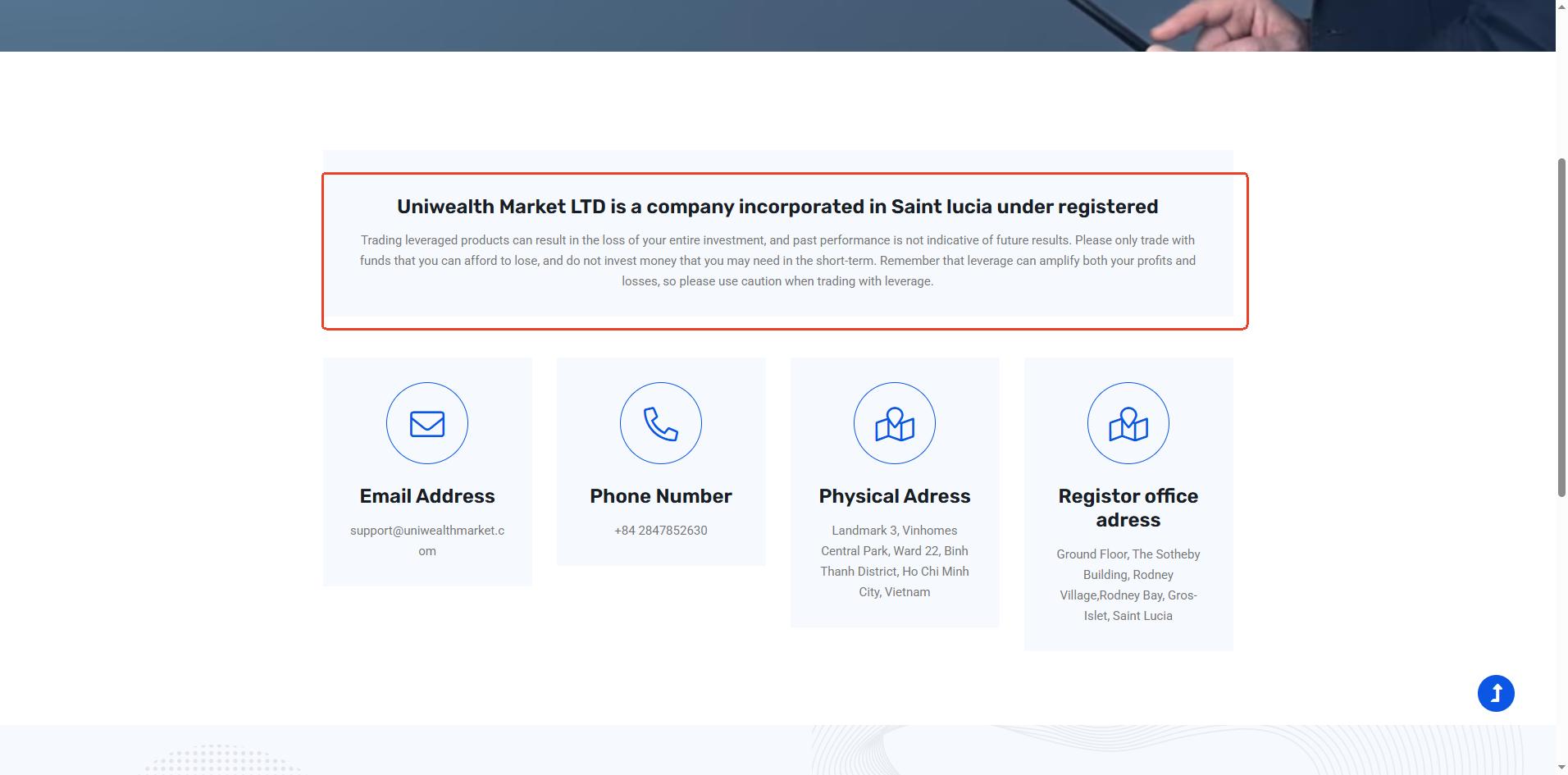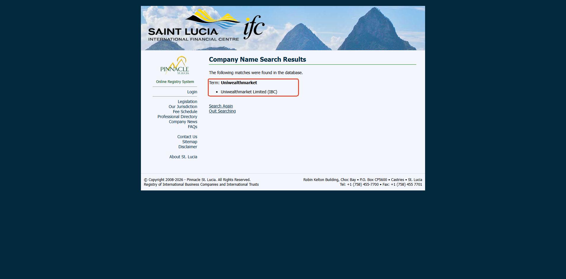 Uniwealth Market does not claim to hold a license from any recognized financial regulator. It cites a registration in Saint Lucia under the name Uniwealthmarket Limited. While we can confirm that a company with this name exists in the Saint Lucia International Financial Centre (IFC) registry, it is important to understand that this registration only confers International Business Company (IBC) status. An IBC does not constitute a valid financial license. The Saint Lucia IFC explicitly does not regulate or license forex trading activities, leaving this entity without official oversight.