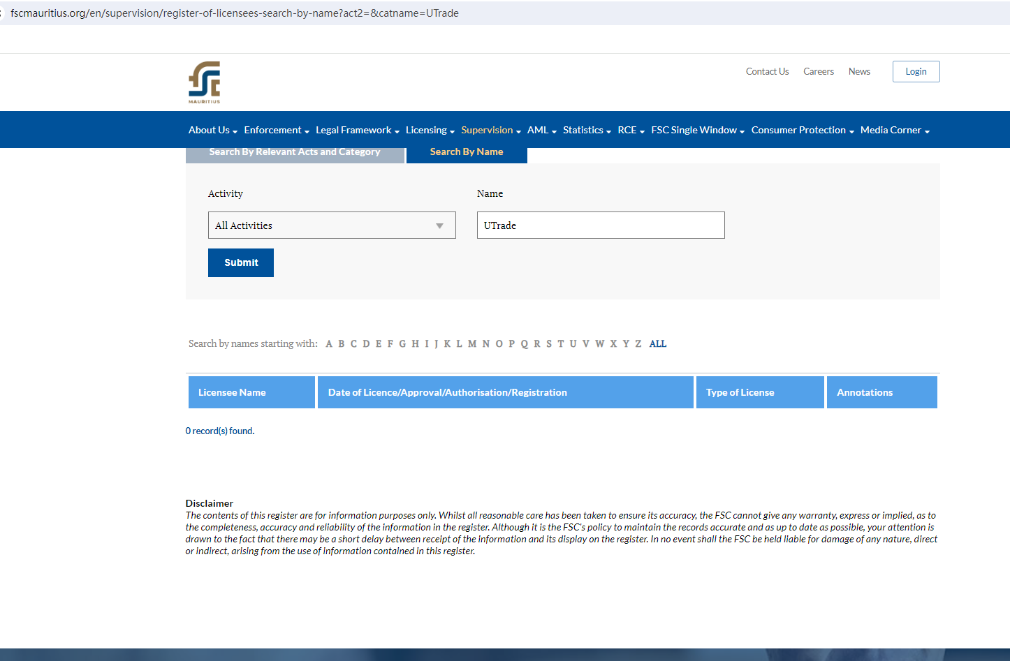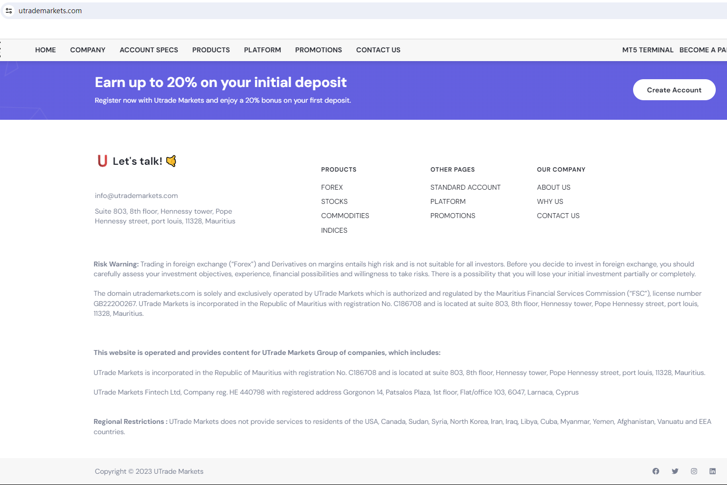 โดยพื้นฐานแล้ว UTrade Markets ไม่ได้อยู่ภายใต้การกำกับดูแลของหน่วยงานกำกับดูแลใดๆ การฝากเงินของนักลงทุนไว้ใน UTrade Markets มีความเสี่ยงสูง เนื่องจากไม่มีกฎหมายคุ้มครองเงินทุน