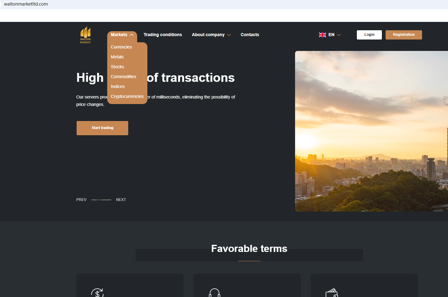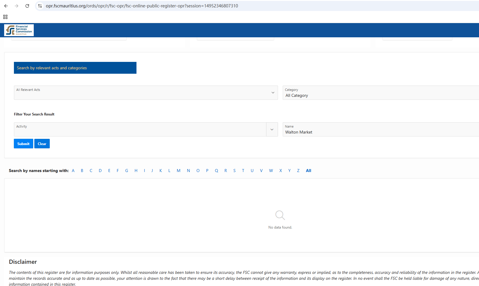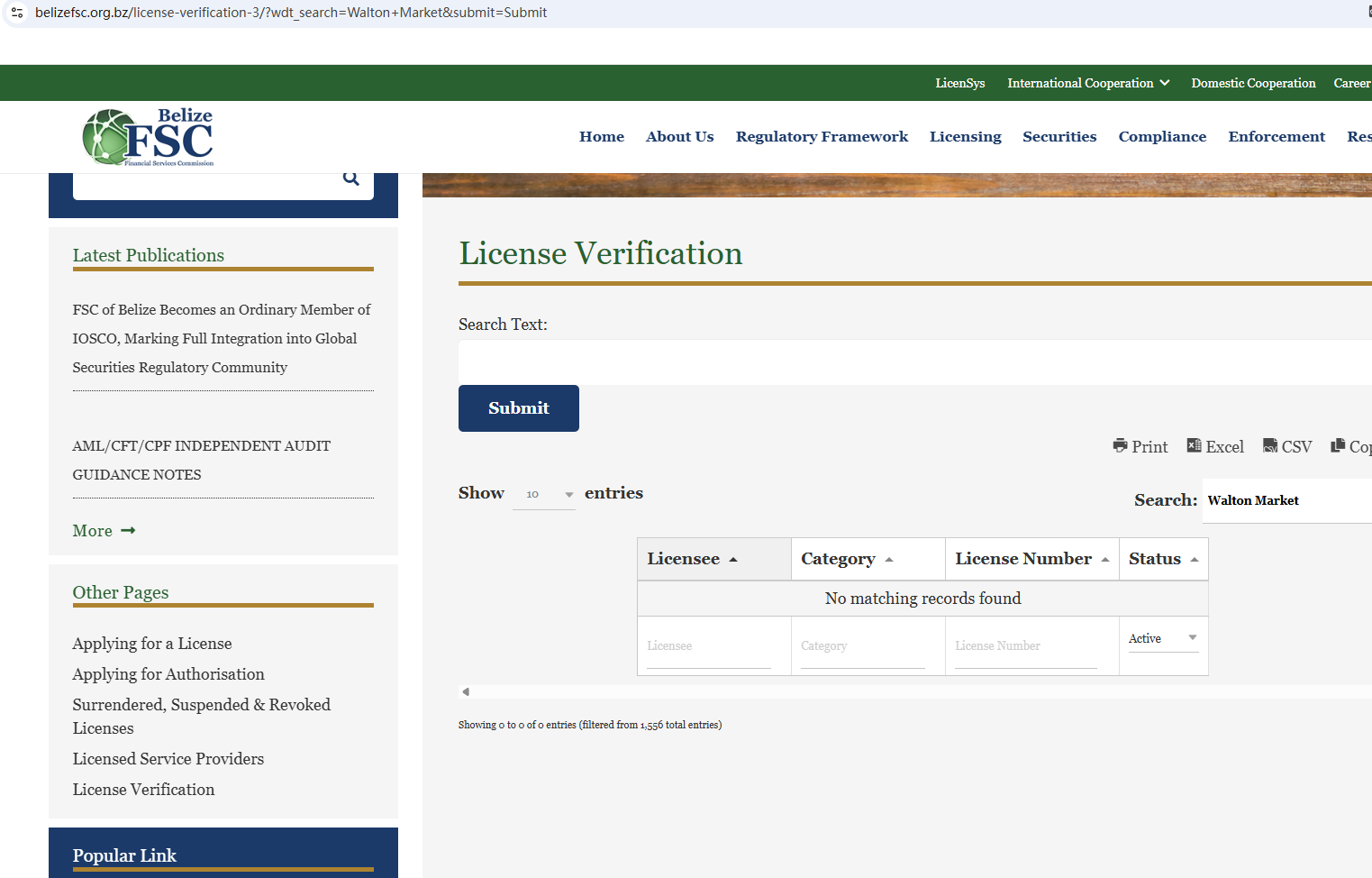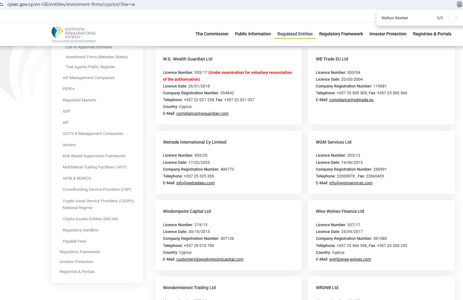 ตามข้อมูลบนเว็บไซต์ บริษัทอ้างว่าได้รับการกำกับดูแลโดยคณะกรรมการกำกับหลักทรัพย์และตลาดหลักทรัพย์ไซปรัส ( CySEC) คณะกรรมการบริการทางการเงินแห่งเบลีซ (Belize FSC)และคณะกรรมการบริการทางการเงินแห่งมอริเชียส (Mauritius FSC)อย่างไรก็ตาม การตรวจสอบไม่พบข้อมูลที่ตรงกับองค์กรใดๆ เหล่านี้ นอกจากนี้ หน่วยงานกำกับดูแลทางการเงินของรัฐบาลกลาง (BaFin) ยังได้ออกคำเตือนต่อ Walton Market เนื่องจากขาดใบอนุญาตที่จำเป็น