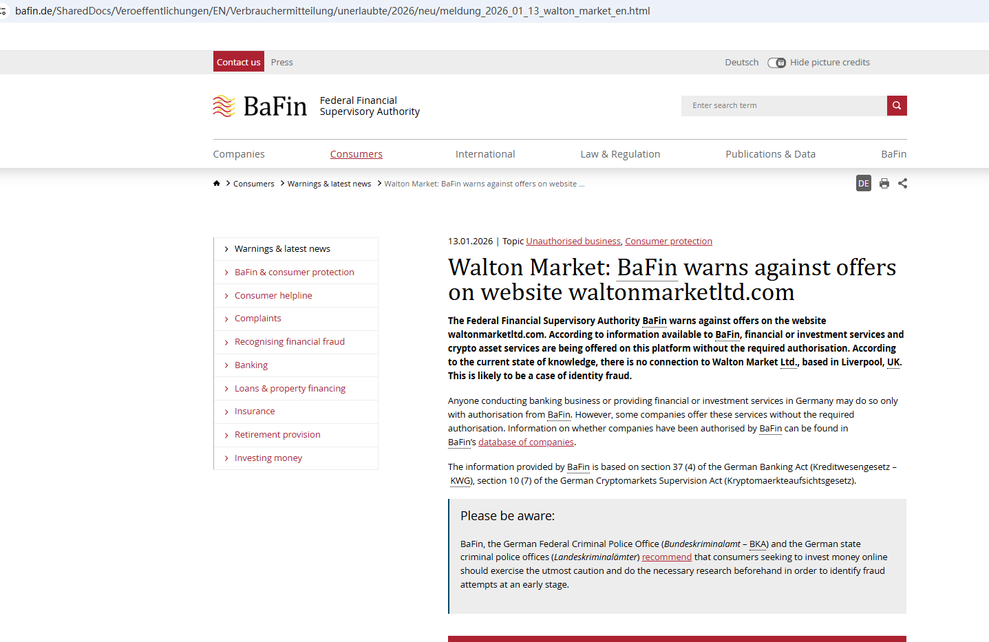เมื่อวันที่ 13 มกราคม 2569 หน่วยงานกำกับดูแลทางการเงินของรัฐบาลกลางเยอรมนี (BaFin) ได้ออกคำเตือนต่อ Walton Market เนื่องจากขาดใบอนุญาตที่จำเป็นhttps://www.bafin.de/SharedDocs/Veroeffentlichungen/EN/Verbrauchermitteilung/unerlaubte/2026/neu/meldung_2026_01_13_walton_market_en.html