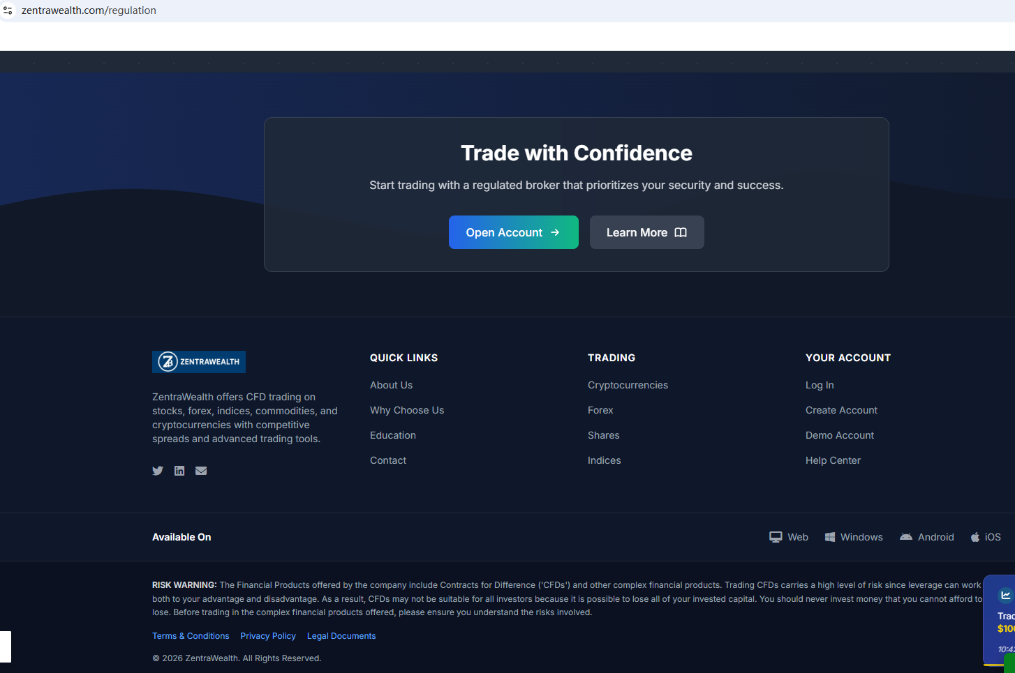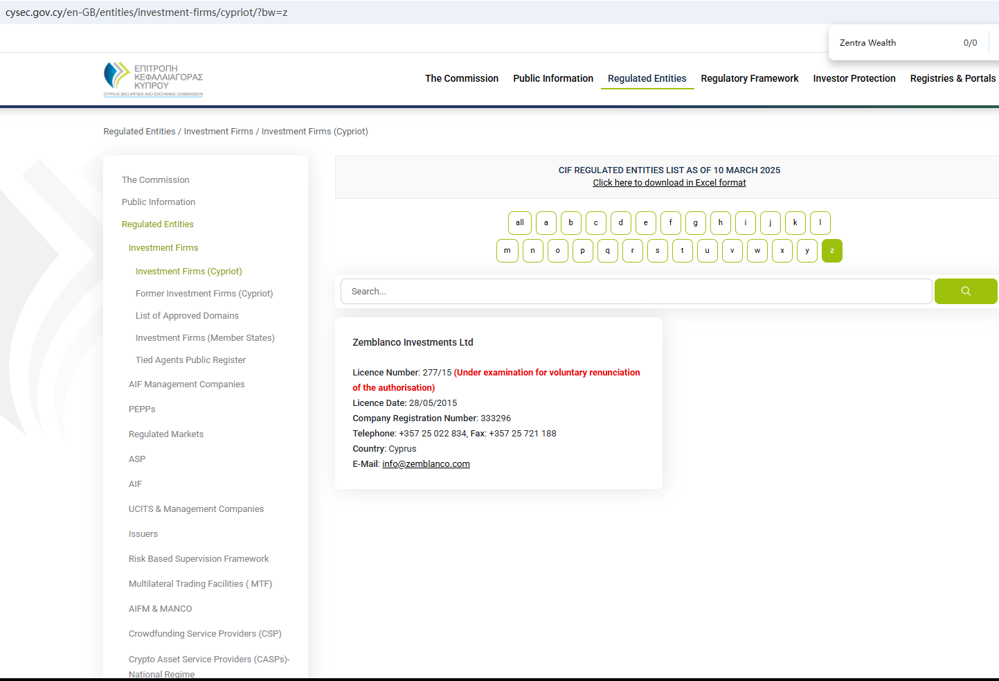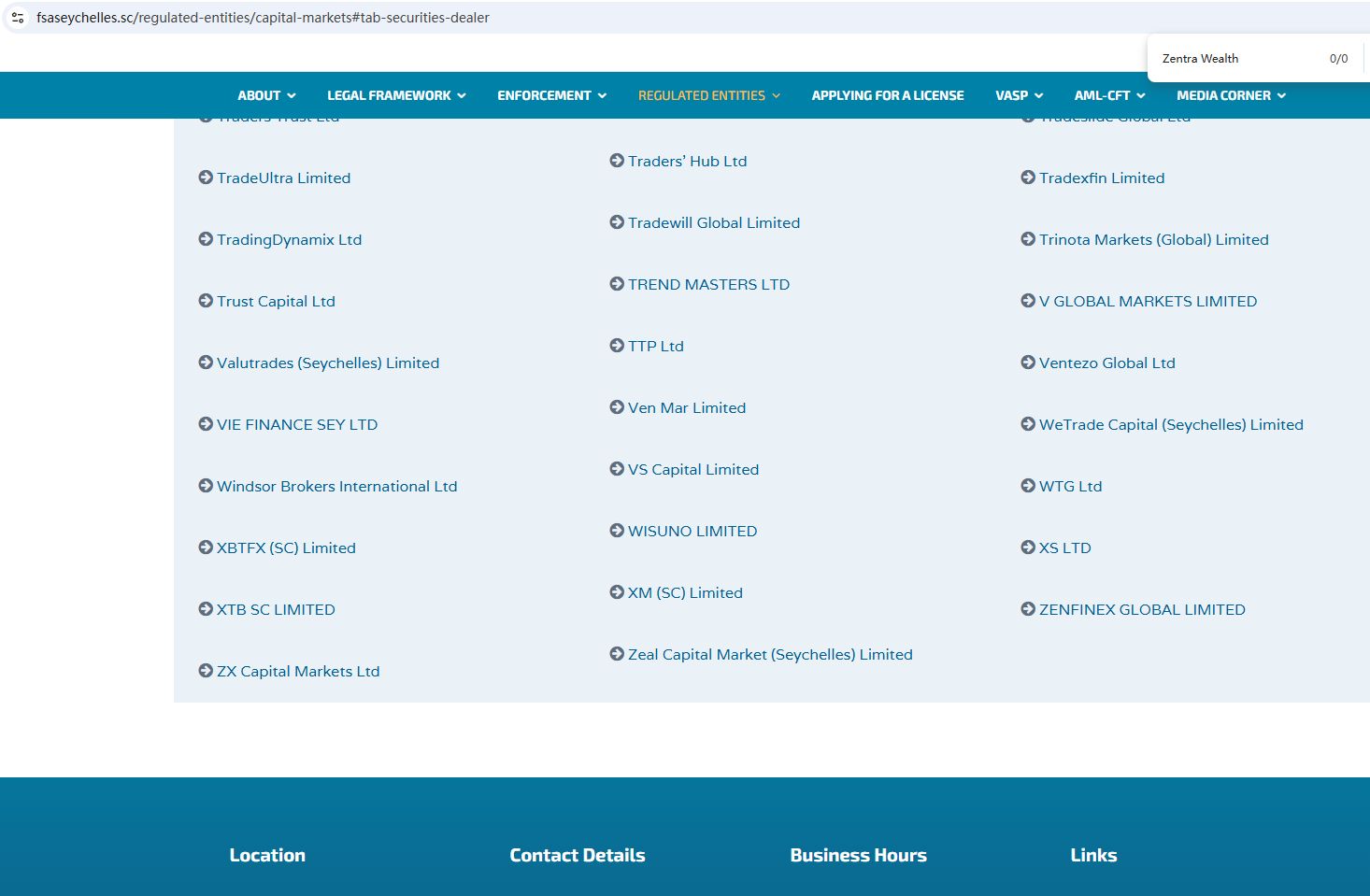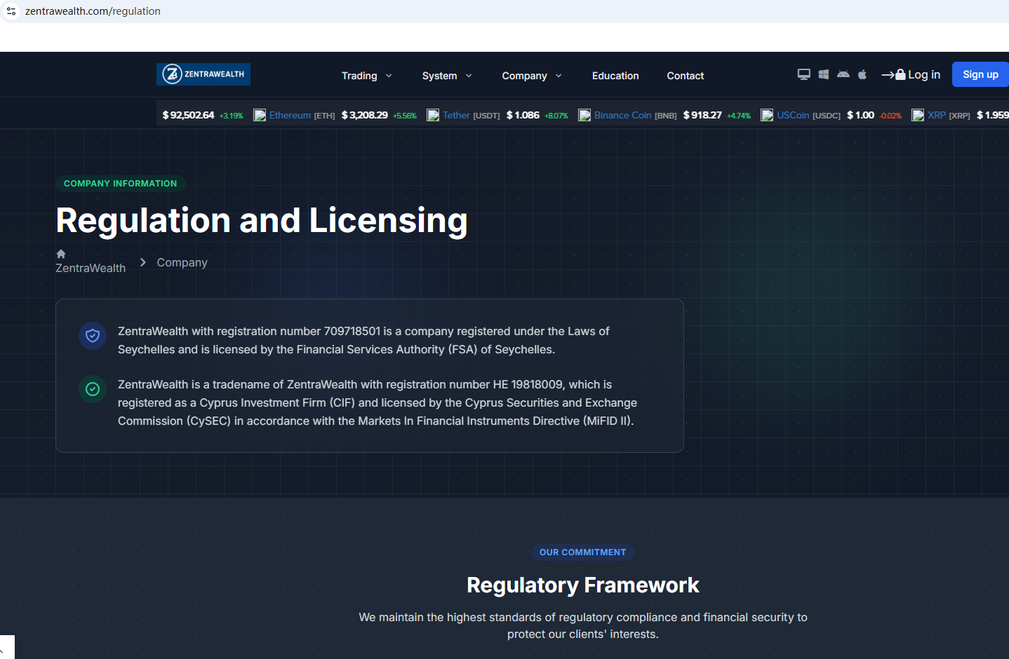 ตามข้อมูลบนเว็บไซต์ บริษัทอ้างว่าได้รับการกำกับดูแลโดยหน่วยงานกำกับดูแลบริการทางการเงินของเซเชลส์ (Seychelles FSA) และคณะกรรมการกำกับหลักทรัพย์และตลาดหลักทรัพย์ของไซปรัส (CySEC) อย่างไรก็ตาม จากการตรวจสอบไม่พบข้อมูลที่ตรงกันใน Seychelles FSA และ CySEC นอกจากนี้ หน่วยงานกำกับดูแลทางการเงิน (FCA) ยังได้ออกคำเตือนเกี่ยวกับ Zentra Wealth โดยสงสัยว่าบริษัทนี้อาจให้บริการหรือผลิตภัณฑ์ทางการเงินโดยไม่ได้รับอนุญาตอย่างถูกต้อง