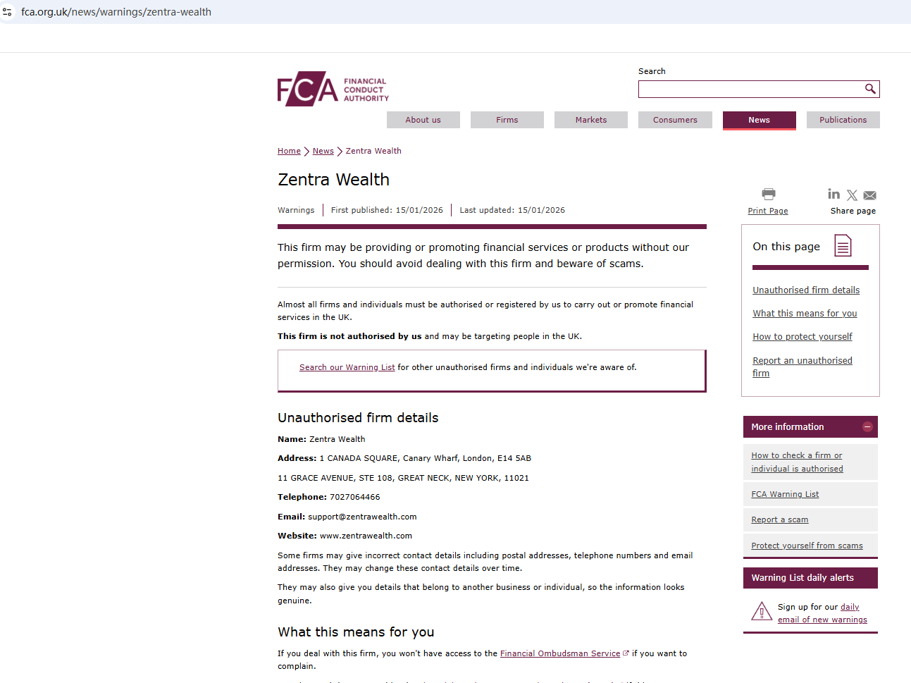 เมื่อวันที่ 15 มกราคม 2569 หน่วยงานกำกับดูแลด้านการเงิน (FCA) ได้ออกคำเตือนเกี่ยวกับ Zentra Wealth โดยสงสัยว่าบริษัทนี้อาจให้บริการหรือผลิตภัณฑ์ทางการเงินโดยไม่ได้รับอนุญาตอย่างถูกต้องhttps://www.fca.org.uk/news/warnings/zentra-wealth