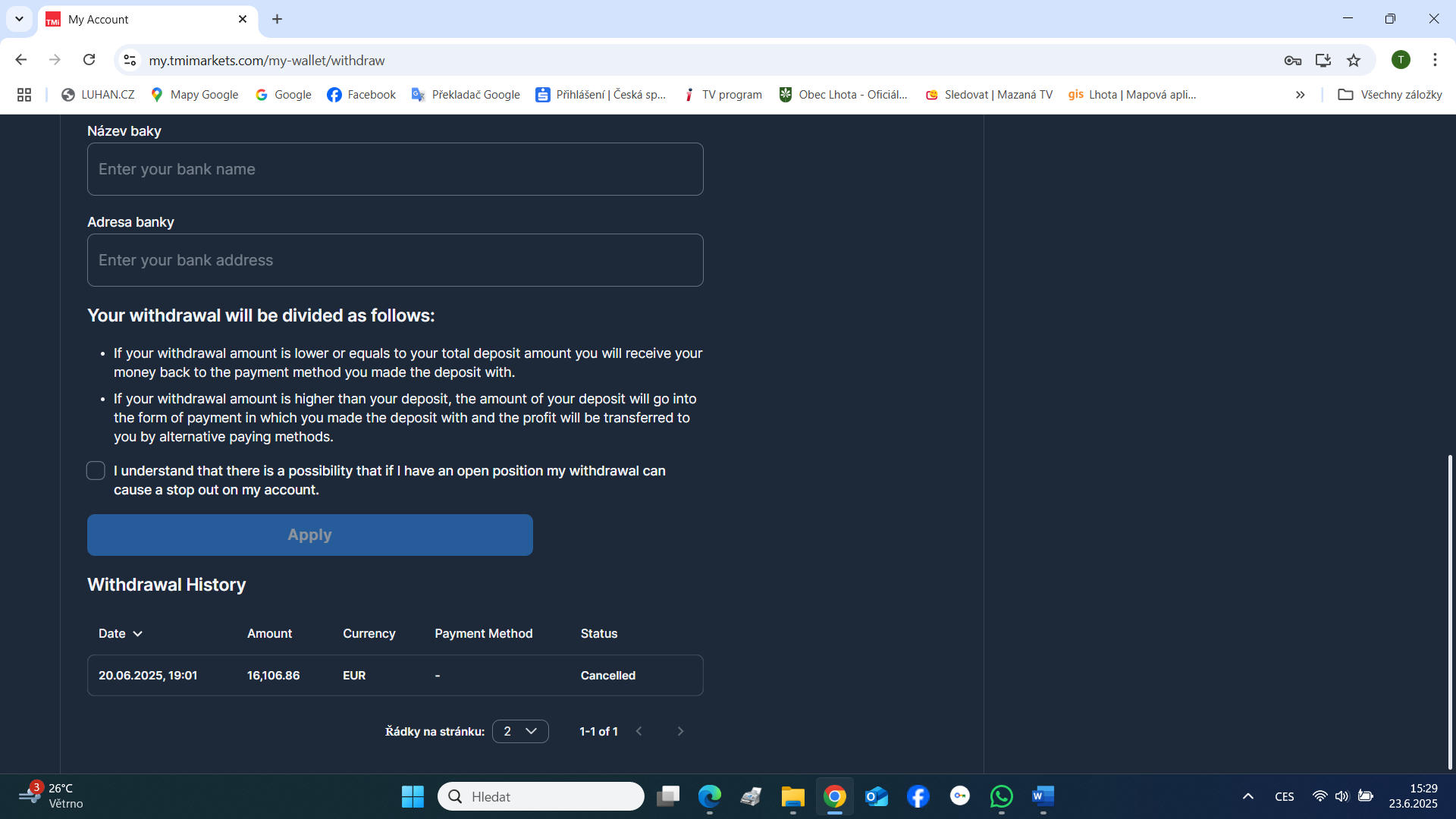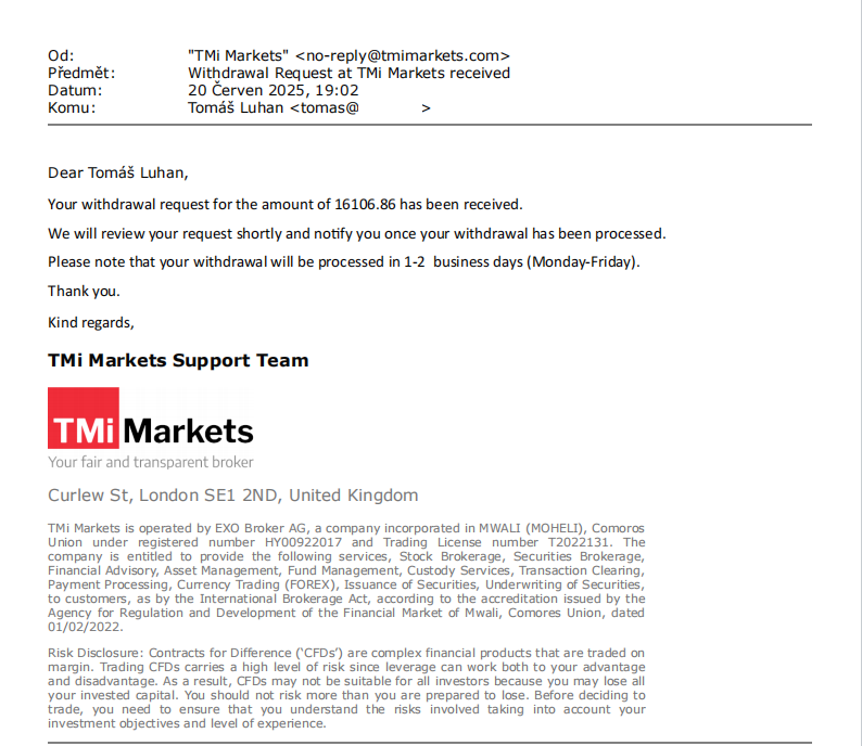 Because I have lost all confidence in working with TMi Markets, I requested a withdrawal of EUR 16,106.86 on June 20, 2025. My request for a cash withdrawal was first confirmed, then rejected without any explanation.
