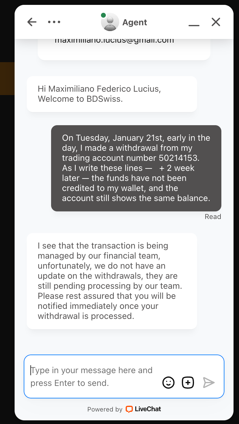 I am writing to seek your help regarding a prolonged withdrawal issue with BDSwiss. On January 21st, I initiated a request to withdraw my funds due to needing liquidity for my annual vacation. However, even after 10 days, I have not received my money.