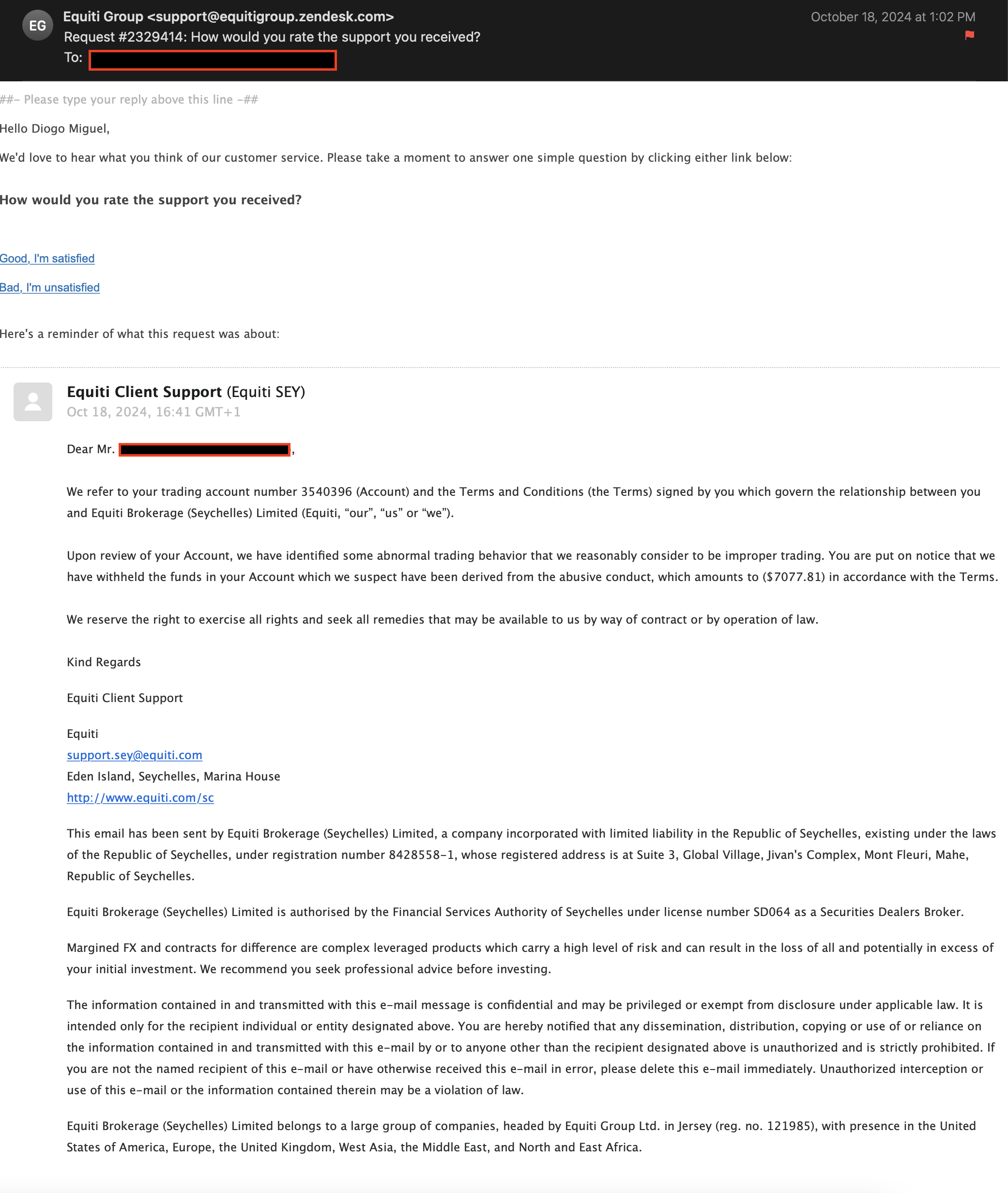 I feel compelled to share my troubling experience with Equiti Brokerage (Seychelles) Limited regarding my trading account (number 3540396). I have never received any contract documentation, raising serious concerns about their legitimacy. After executing 2,352 trades, I was blindsided by accusations of "improper trading," with no prior warning or evidence provided.