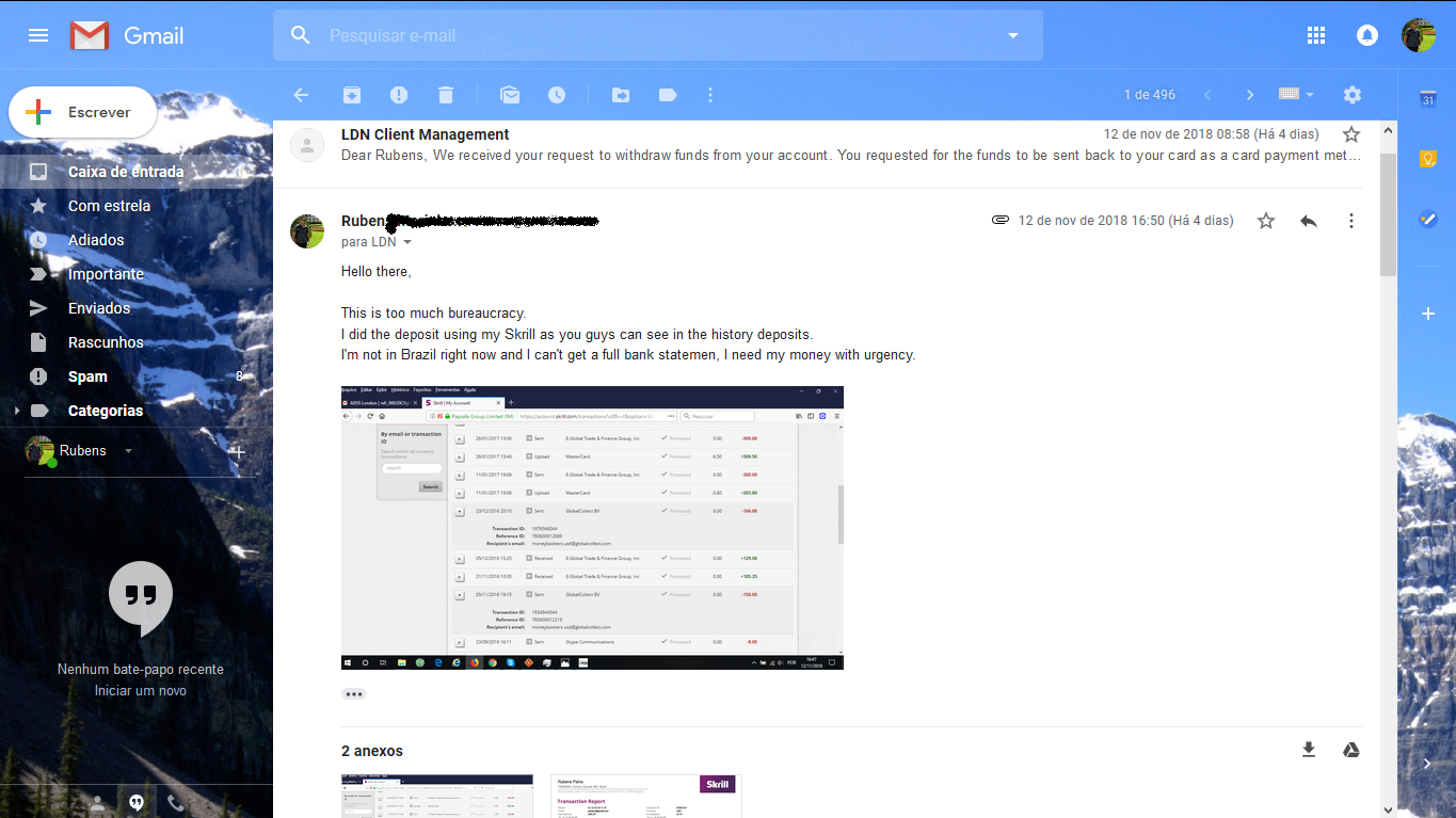 Last week I request a simple withdrawal (a couple of bucks to be honest) and they asked for dozens of confirmations only because I was asking for my own money... but OK I did everything that they asked without any fight or discussion and a representative called to confirm again my request because one of the documents was the bank statement and they couldn't able to read it because it is in Portuguese (my country language), so I did everything they asked and blablablabla and now, GUESS WHAT... SURPRISE!!!