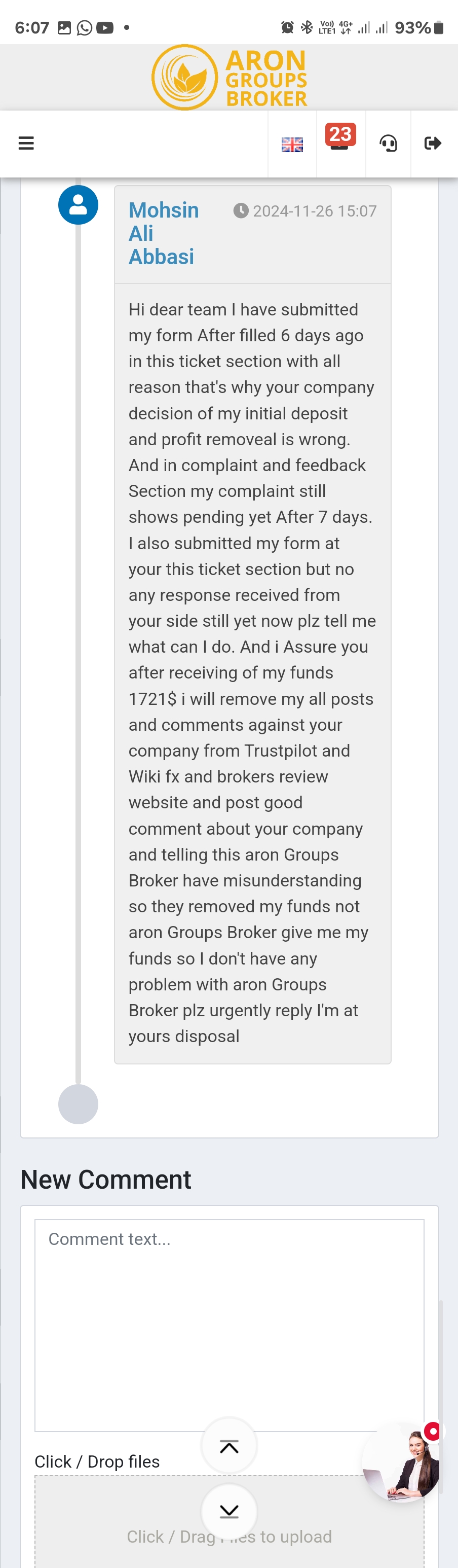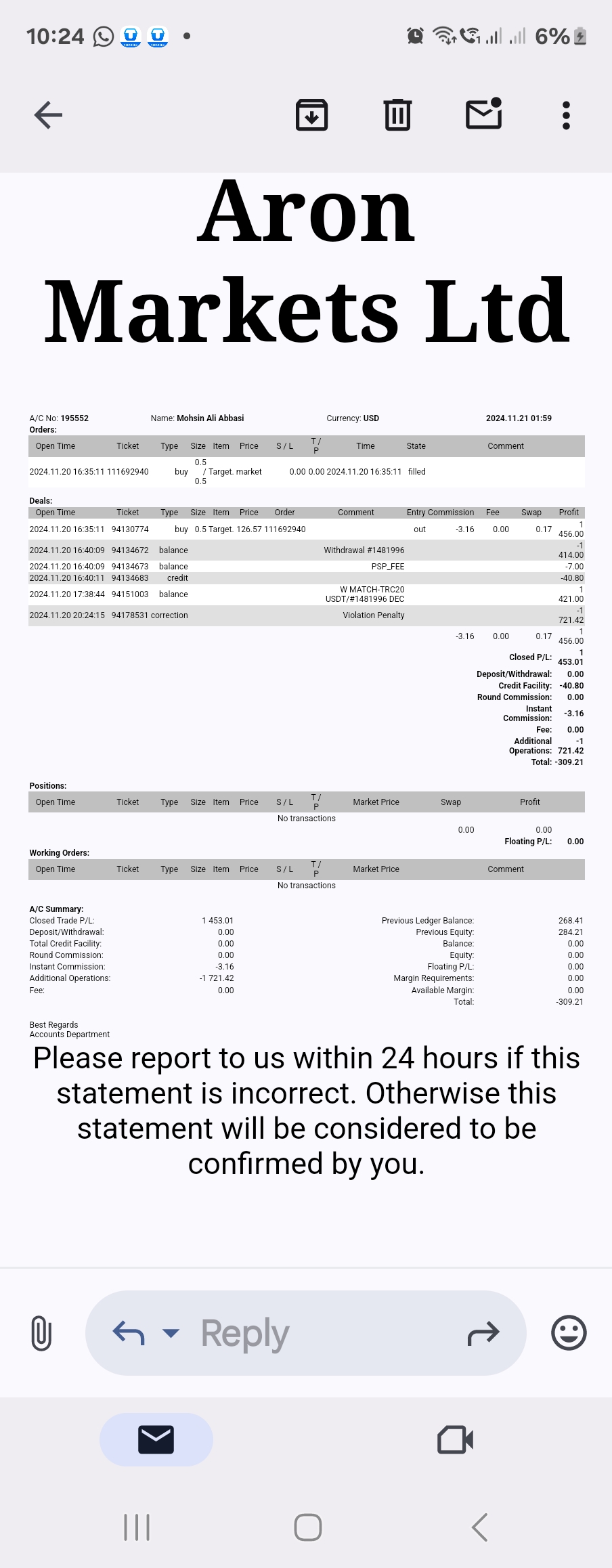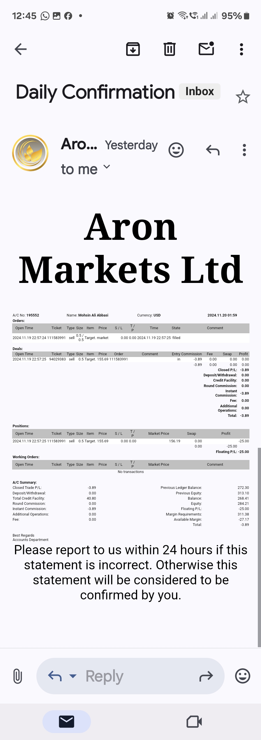 My name is Mohsin Ali Abbasi, and I opened an account with Aron Market with the MT5 Account No. 195552. I would like to bring to your attention an incident that has occurred with my account, leading me to conclude that Aron Market is engaging in unethical practices.