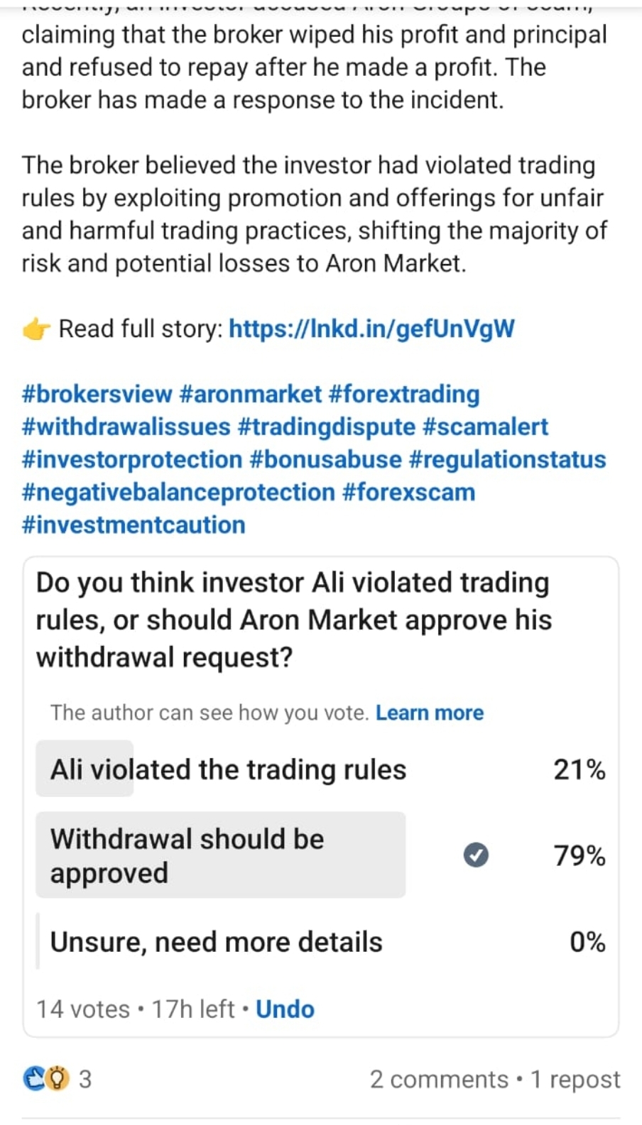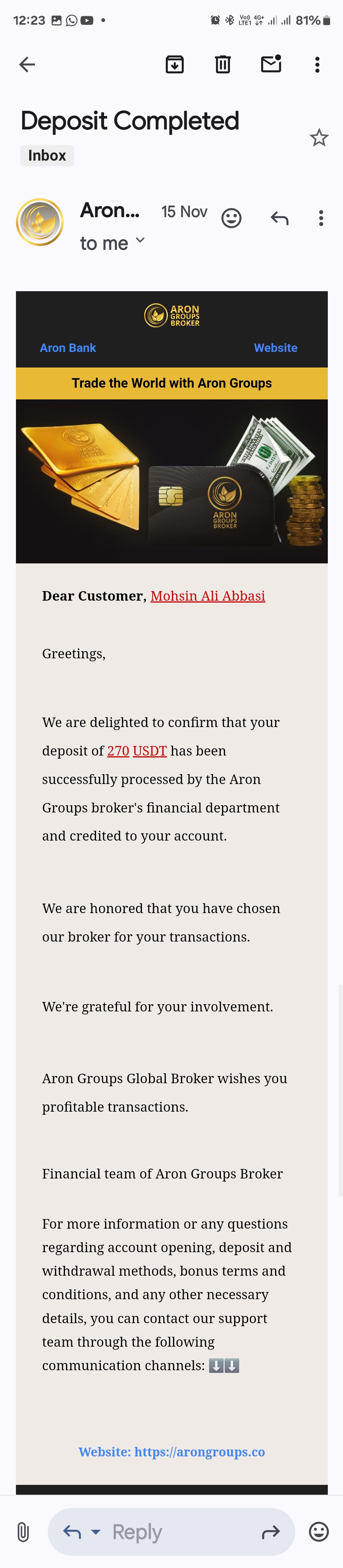 On 15th November 2024, I deposited $270 into my account and opened a sell trade of 50 shares of US stock Target (TGT). I made a profit of $1,454. However, when I requested to withdraw my profits, Aron Market canceled all my profits and even confiscated my initial deposit. They emailed me, accusing me of fraudulent trading. Aron Market claimed that I violated their rules and misused their Negative Balance Protection (NBP) policy. However, this accusation seems highly dubious. Before this incident, I experienced losses totaling $1,200 those times the broker never mentioned any rule violations or sent me an email about such concerns. Instead, they encouraged me to make further deposits as I was losing. Now, when I finally made a profit, they conveniently claim I broke their rules.The broker states that I misused their Negative Balance Protection feature. Yet, their system automatically resets negative balances to zero after two hours. This automated facility is provided by their platform. I fail to understand how trading based on speculation or market news can be considered fraudulent. When I lost money, they did not raise any concerns about rule violations. But now that I have profited, they refuse to honor my earnings and confiscated both my profit and capital. I strongly believe this broker is scamming its clients. Aron Market appears to run standalone servers that are not connected to legitimate exchanges. If my trading strategy resulted in a loss, would the company compensate me for my loss? If not, why is the company penalizing me for Earning profit.
