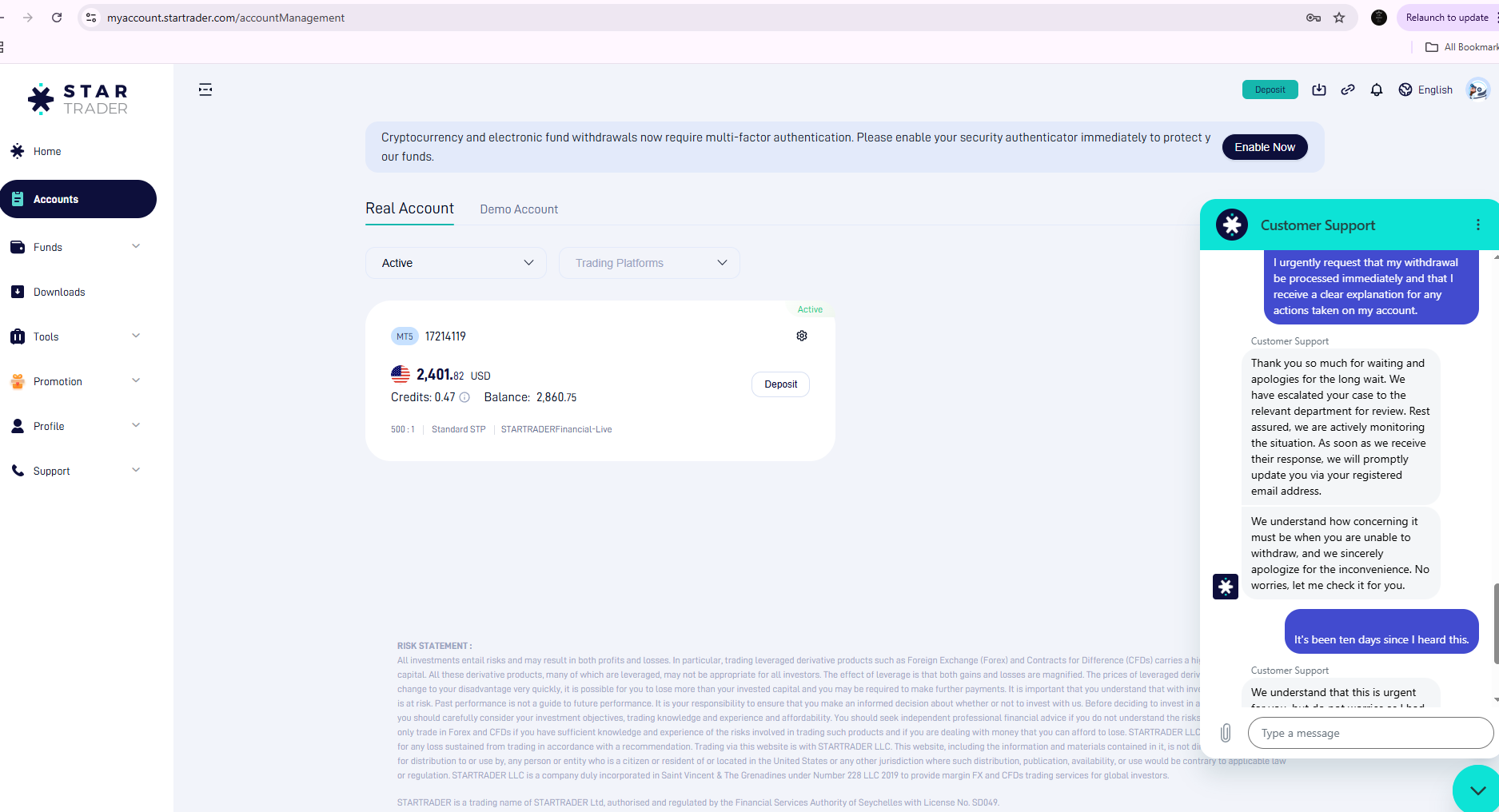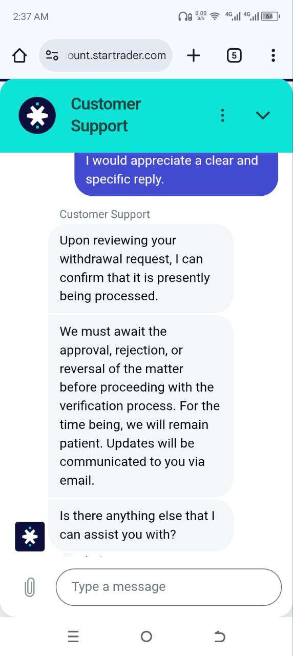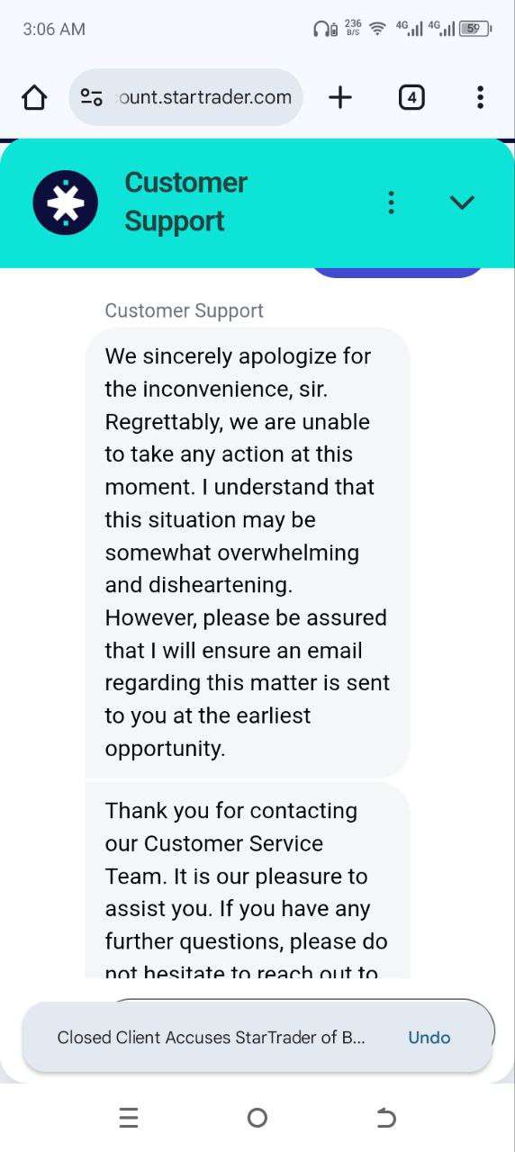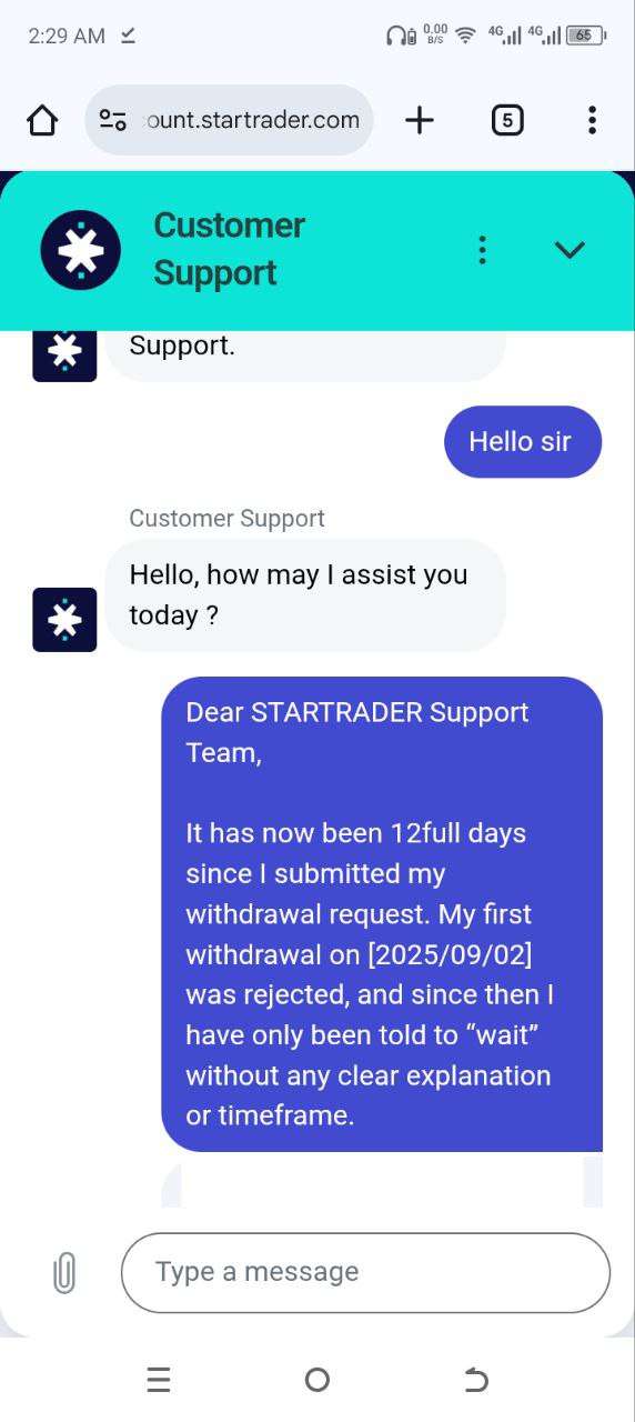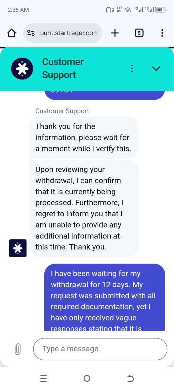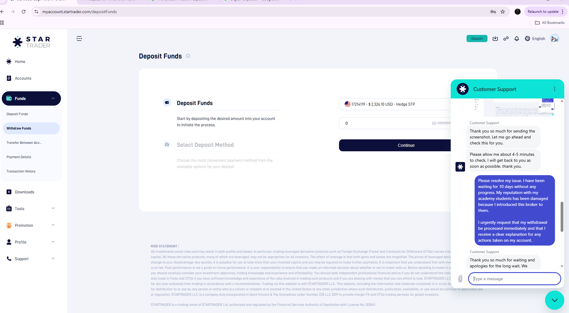 I run a trading academy and had recommended STARTRADER to my students. Due to the prolonged delay and lack of clear communication, my professional credibility and the reputation of my academy are being damaged.