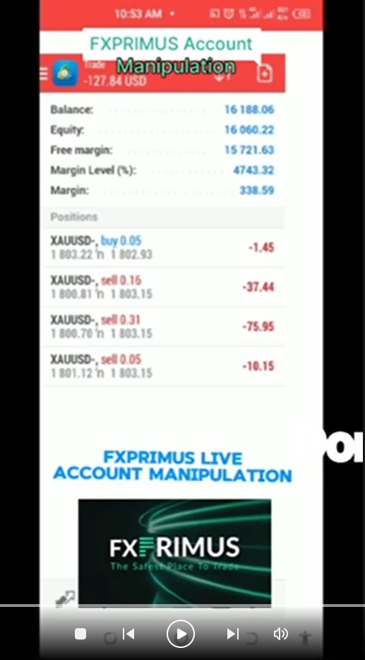 Dear broker review, I my trading account was manipulated by FXPRIMUS. In the seen, my trades are stop once it reach a a certain level of move with the lots size taken to zero , amount in account deducted and when I laid a complain with the recoded video my account was deleted and all data on the account remove to the point I could no longer access the account and the balance funds . I had over 7 accounts , the account in which I saw the live manipulation the funds loss was over $185,000 And all the other six accounts also close without me having access to. My business crumbled and they said they can’t do anything that I should do what ever I want. I work as IB for them and introduced new traders that loss money as well. I submitted the video already and I need your held to recover my funds and I have been lucked up several time because of money owed to my clients