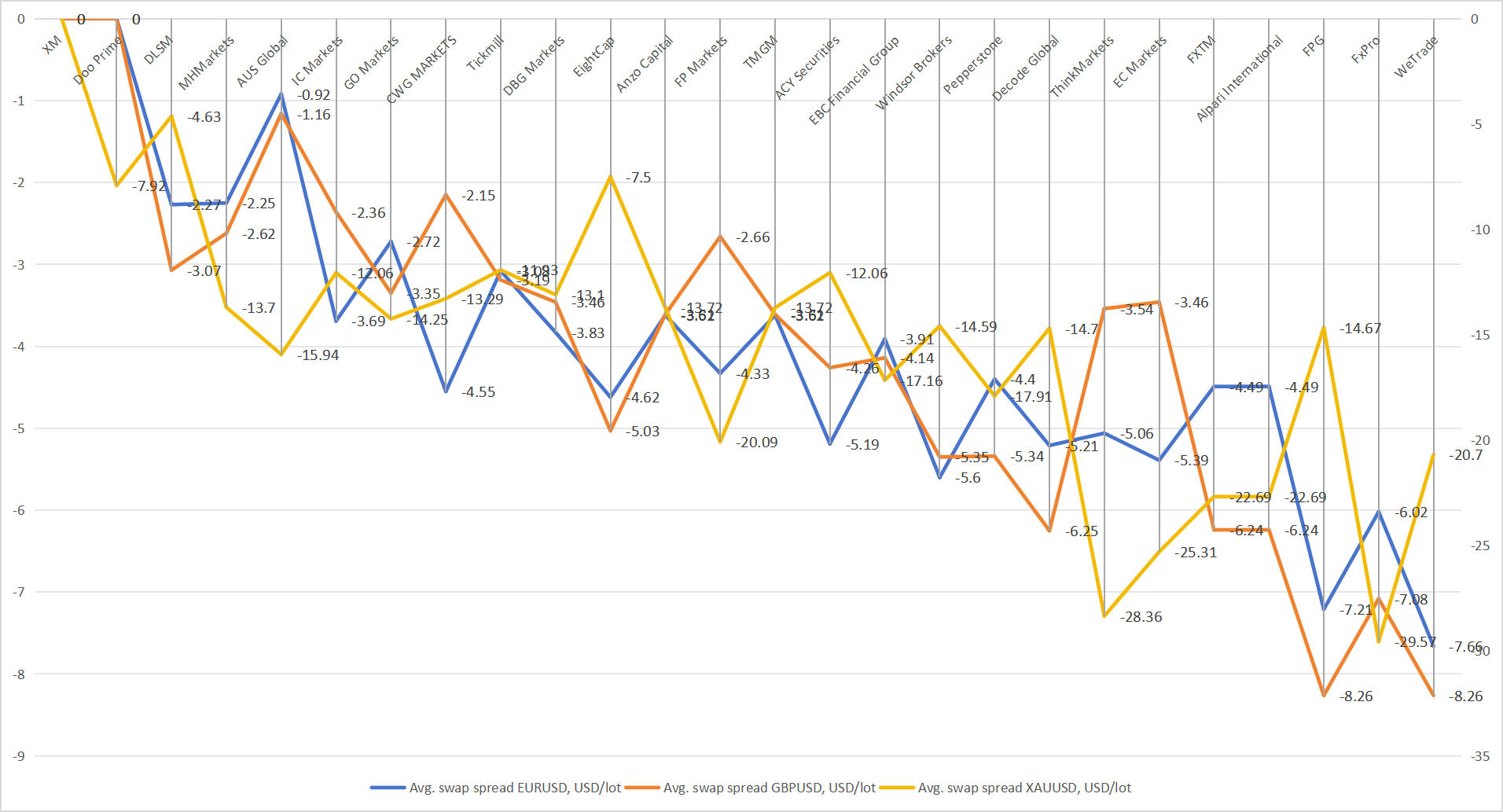 การทำความเข้าใจอัตราสวอปถือเป็นสิ่งสำคัญสำหรับผู้ซื้อขายฟอเร็กซ์ โดยเฉพาะผู้ที่ถือสถานะข้ามคืน โดยการวิเคราะห์ค่าสวอปเฉลี่ยของโบรกเกอร์ต่างๆ ผู้ซื้อขายสามารถระบุตัวเลือกที่คุ้มต้นทุนที่สุดได้ จากข้อมูลในเดือนกันยายน แพลตฟอร์มเช่น XM และ Doo Prime มักเสนอค่าธรรมเนียมที่ต่ำกว่า ในขณะที่โบรกเกอร์เช่น FxPro และ WeTrade มักมีค่าธรรมเนียมที่สูงกว่า
