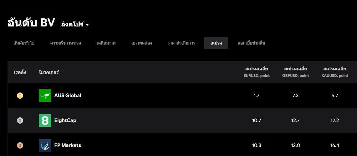NO.1: AUS Globalสเปรดเฉลี่ยของ EURUSD, GBPUSD และ XAUUSD คือ 1.7, 7.3 และ 5.7 จุด ตามลำดับ