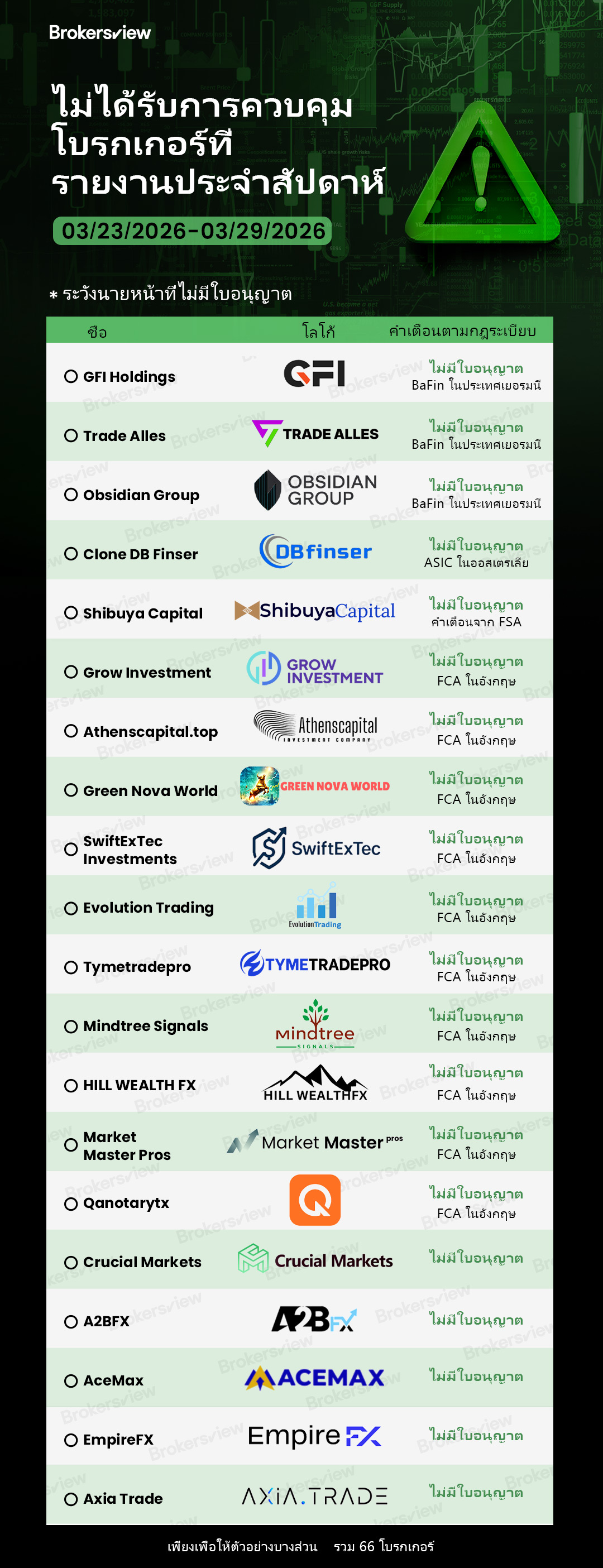 โบรกเกอร์ที่ไม่มีใบอนุญาตซึ่งรายงานโดย BrokersView ระหว่างวันที่ 23-29 มีนาคม 2569 :