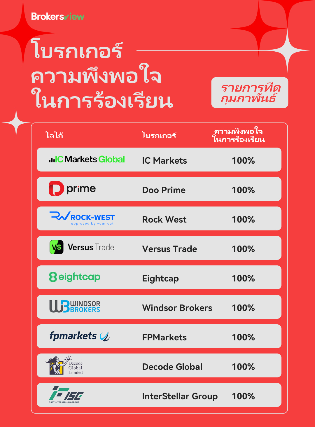 นักลงทุนส่วนใหญ่ โดยเฉพาะมือใหม่ มักมองข้ามทัศนคติในการให้บริการของโบรกเกอร์เมื่อเลือกแพลตฟอร์มการซื้อขาย อย่างไรก็ตาม วิธีที่โบรกเกอร์ปฏิบัติต่อลูกค้าสามารถส่งผลกระทบอย่างมากต่อประสบการณ์การซื้อขายโดยรวม ดังนั้น เพื่อช่วยให้นักลงทุนตัดสินใจได้อย่างมีข้อมูล BrokersView จึงอัปเดตรายชื่อโบรกเกอร์ทุกเดือนและจัดอันดับตามความพึงพอใจในการจัดการข้อร้องเรียน เป้าหมายของเราคือการให้คำแนะนำอ้างอิงที่เป็นประโยชน์เกี่ยวกับว่าโบรกเกอร์ให้ความสำคัญกับความคิดเห็นของลูกค้าหรือไม่ และระดับการบริการลูกค้าโดยรวมที่พวกเขานำเสนอ