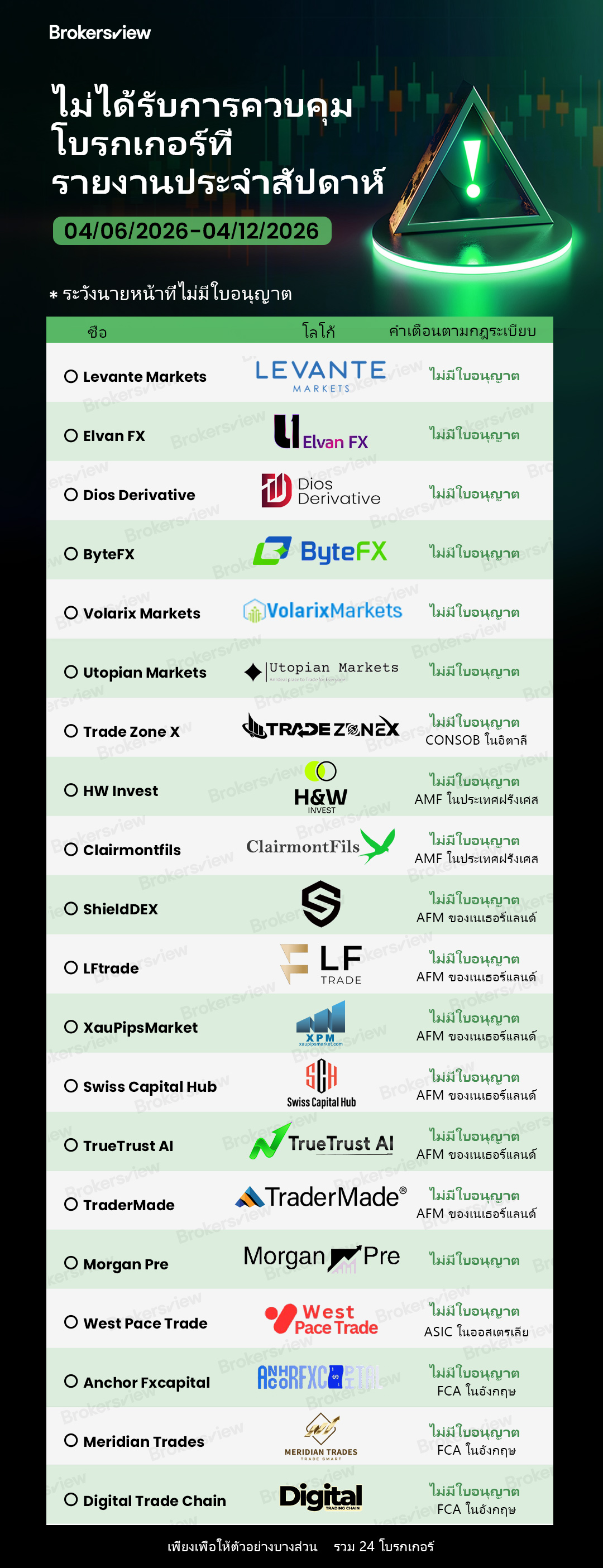 ในช่วงระหว่างวันที่ 6 – 12 เมษายน 2569 มีโบรกเกอร์ 13 รายที่ได้รับคำเตือนอย่างเป็นทางการจากหน่วยงานกำกับดูแล ได้แก่ CONSOB ของอิตาลี, AMF ของฝรั่งเศส, AFM ของเนเธอร์แลนด์, ASIC ของออสเตรเลีย และ FCA ของสหราชอาณาจักร นอกจากนี้ยังพบโบรกเกอร์ที่ไม่ได้รับการกำกับดูแลอีก 11 ราย การซื้อขายกับหน่วยงานเหล่านี้ไม่มีการคุ้มครองนักลงทุน