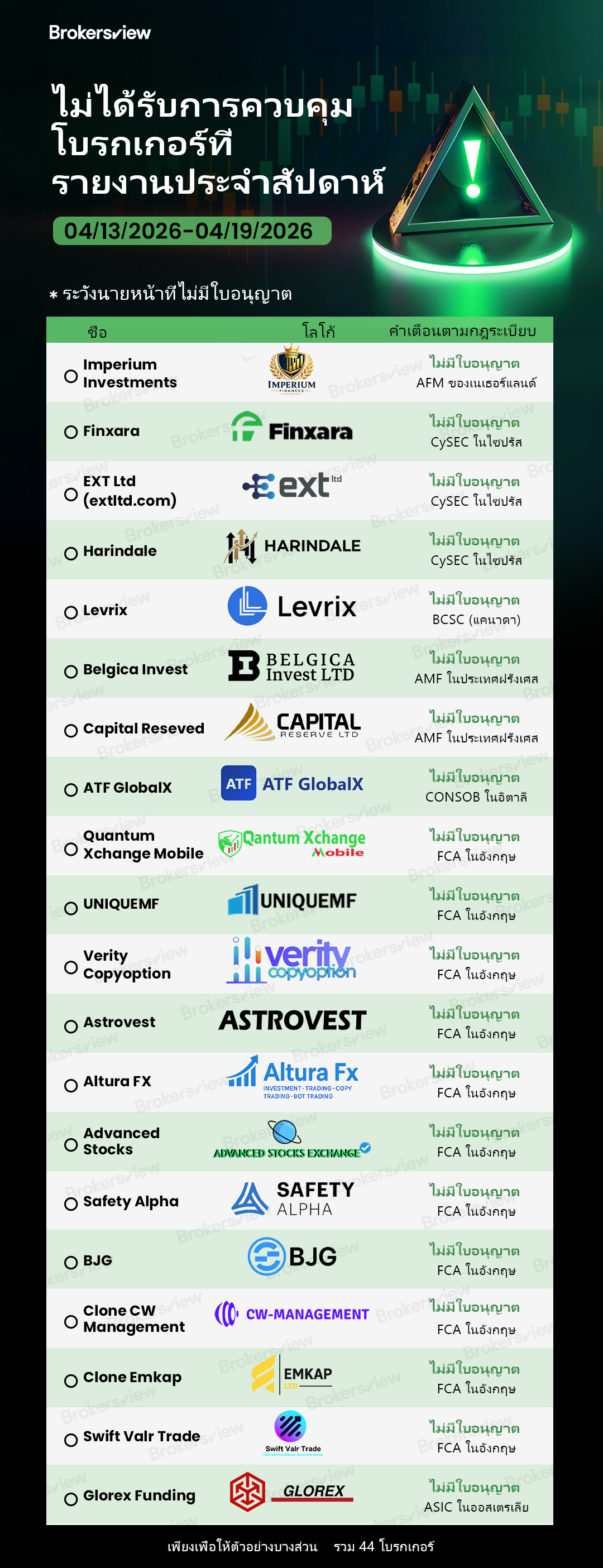 ในช่วงสัปดาห์ระหว่างวันที่ 13-19 เมษายน Brokersview ได้ระบุโบรกเกอร์ที่ไม่ได้รับการกำกับดูแลหรือได้รับการเตือนจากหน่วยงานกำกับดูแลรวม 44 ราย