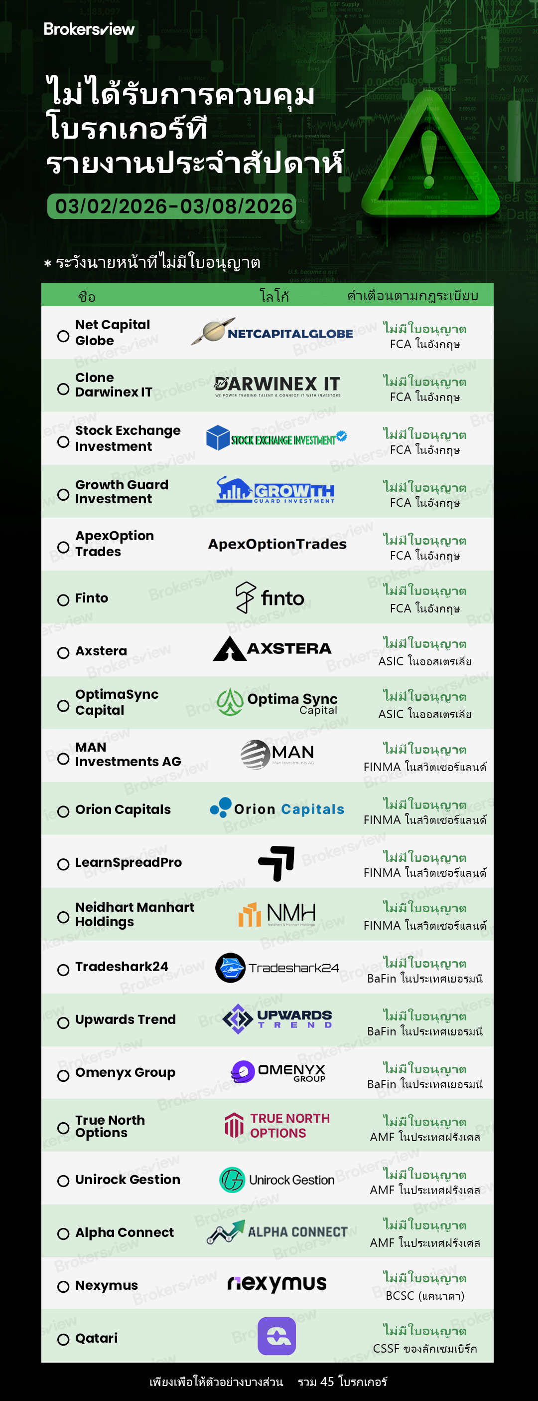 รายชื่อนายหน้าซื้อขายหลักทรัพย์ที่ไม่มีใบอนุญาต ซึ่งรายงานโดย BrokersViewระหว่างวันที่ 2 มีนาคม ถึง 8 มีนาคม 2026 (รายชื่อบางส่วน):