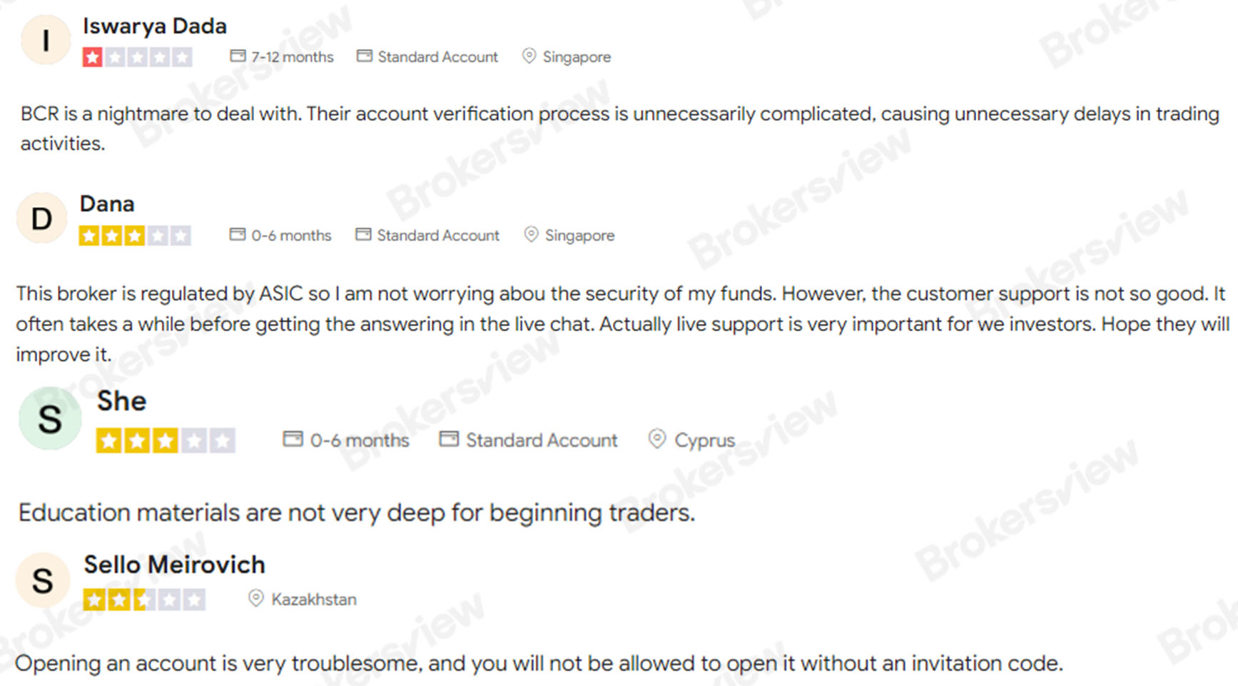 มีรายงานว่า BCR ทําให้ลูกค้าประสบปัญหาบ่อยครั้ง เช่น ความยากลําบากในการถอนเงิน การบริการลูกค้าที่ไม่ดี การระงับบัญชีของลูกค้าเมื่อพวกเขาซื้อขายอย่างมีกําไร และการยกเลิกบัญชีโดยไม่ต้องแจ้งให้ลูกค้าทราบ