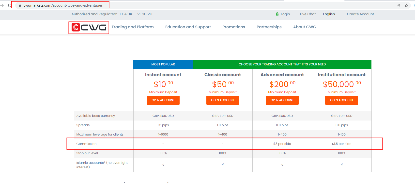 We've found relevant information in the "Comparison of Account Types" section on CWG MARKETS and the screenshot below could help in locating the information. To achieve the most accurate and current answer, however, we recommend that you ask the official customer services directly for a more accurate answer. For more details on this broker, please check our full CWG MARKETS review.
