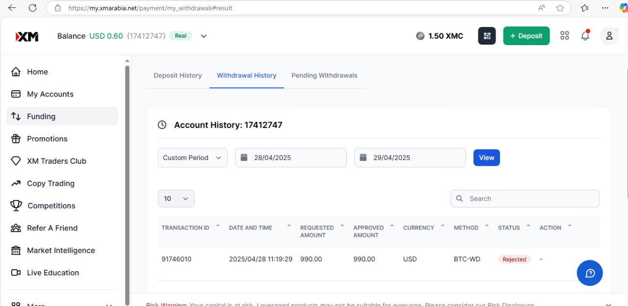 I deposited $998 at XM and lost 8$ after trading, now XM rejected my withdraw request of the remaining $990.
