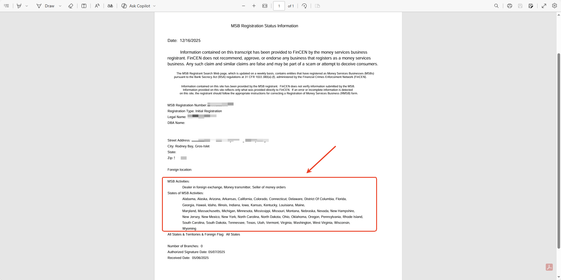 3. จากนั้นคุณจะเห็นข้อมูลสรุปเกี่ยวกับโบรกเกอร์บนเว็บไซต์ FinCEN คลิกที่ชื่อโบรกเกอร์เพื่อดาวน์โหลดเอกสารและตรวจสอบรายละเอียดการลงทะเบียน รวมถึงกิจกรรม MSB ที่ได้รับอนุญาต