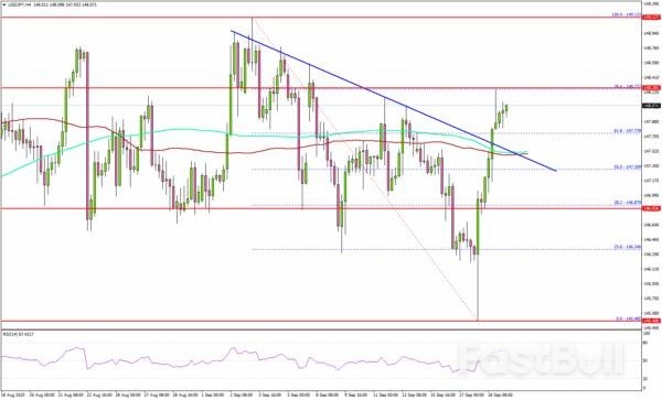 เมื่อพิจารณาจากกราฟราย 4 ชั่วโมง คู่เงินนี้ไต่ขึ้นเหนือแนวต้านที่ 146.50 และ 147.00 ที่สำคัญกว่านั้น คู่เงินนี้ทะลุแนวต้านสำคัญที่ 147.50 ทะลุเส้นแนวโน้มขาลงหลักได้ ส่งผลให้ราคามีโอกาสปรับตัวขึ้นเหนือระดับ Fibonacci 50% ของราคาขาลง จากจุดสูงสุดที่ 149.13 ลงมาที่จุดต่ำสุดที่ 145.48