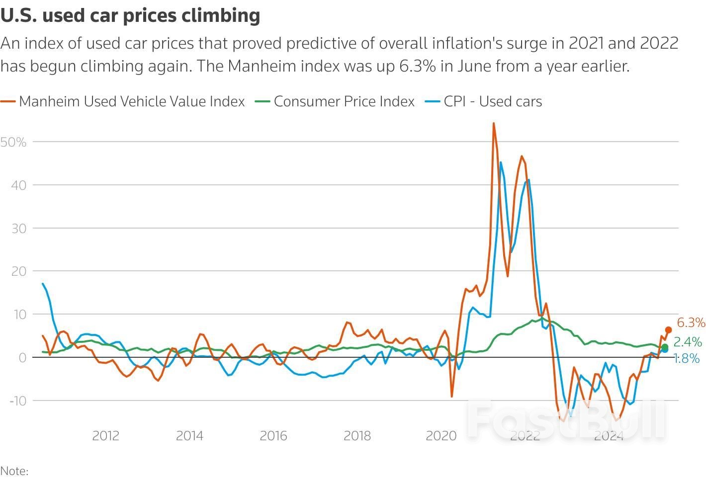 ดัชนีมูลค่ารถใช้แล้วของแมนไฮม์เพิ่มขึ้น 1.6% ในเดือนมิถุนายนจากเดือนพฤษภาคมเมื่อปรับตามฤดูกาล และพุ่งขึ้น 6.3% จากปีก่อน ซึ่งถือเป็นการเพิ่มขึ้นเมื่อเทียบเป็นรายปีครั้งใหญ่ที่สุดนับตั้งแต่เดือนสิงหาคม 2022 ตามข้อมูลที่เผยแพร่เมื่อวันอังคาร โดยดัชนีอยู่ที่ 208.5 ซึ่งมีแนวโน้มเพิ่มขึ้นมาเป็นเวลา 1 ปีแล้ว และขณะนี้ถือเป็นระดับสูงสุดนับตั้งแต่เดือนตุลาคม 2023