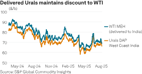Platts ซึ่งเป็นส่วนหนึ่งของ SP Global Commodity Insights ประเมินราคาน้ำมันดิบ Urals ไว้ที่ 2.74 ดอลลาร์สหรัฐต่อบาร์เรลจากราคาอ้างอิงดูไบเมื่อวันที่ 15 สิงหาคม ซึ่งสะท้อนถึงราคาน้ำมันดิบ Urals ที่มีส่วนลดมากกว่าสัปดาห์ก่อนหน้าถึง 76 เซนต์ อย่างไรก็ตาม ราคาน้ำมันดิบเดลต้ายังคงต่ำกว่าระดับล่าสุดที่สูงกว่า 5 ดอลลาร์สหรัฐต่อบาร์เรลในเดือนมกราคมอย่างมาก