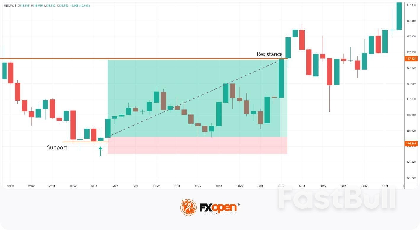 เทรดเดอร์มองหาแท่งเทียน Inverted Hammer ที่เป็นขาขึ้นบนกราฟ USDJPY หลังจากแนวโน้มขาลงที่ตามมา แท่งเทียน Inverted Hammer จะเป็นโอกาสเข้าซื้อที่สอดคล้องกับระดับแนวรับ พวกเขาเข้าสู่ตลาดเมื่อราคาปิดของแท่งเทียน Inverted Hammer และวางจุดตัดขาดทุนไว้ต่ำกว่าระดับแนวรับ เป้าหมายการทำกำไรของพวกเขาอยู่ที่ระดับแนวต้านถัดไป เทรดเดอร์สามารถใช้แนวทางที่ระมัดระวังมากขึ้น และรอให้แท่งเทียนก่อตัวขึ้นในทิศทางขาขึ้นอย่างน้อยสองสามแท่ง อย่างไรก็ตาม เนื่องจากรูปแบบนี้เกิดขึ้นที่กราฟ 5 นาที เทรดเดอร์อาจสูญเสียโอกาสในการเทรดหรือเข้าสู่ตลาดด้วยอัตราส่วนความเสี่ยงต่อผลตอบแทนที่ต่ำ