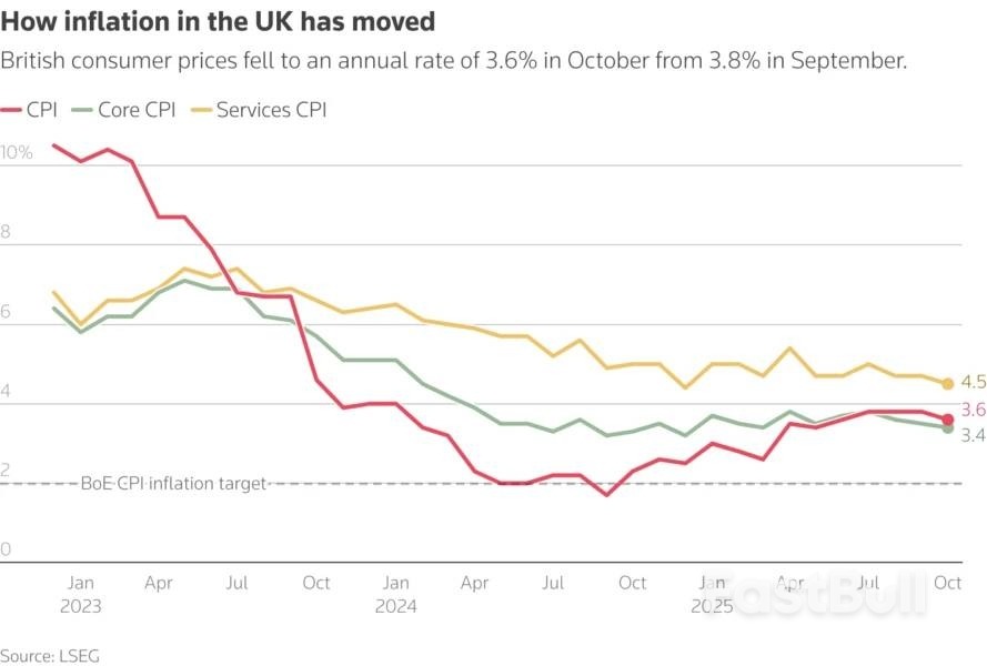 ในเดือนตุลาคม อัตราเงินเฟ้อทั่วไปลดลงเล็กน้อยมาอยู่ที่ 3.6% ต่อปี ซึ่งยังคงสูงกว่าเป้าหมาย 2% ของธนาคารกลางอังกฤษ แต่เป็นการลดลงครั้งแรกนับตั้งแต่เดือนพฤษภาคม