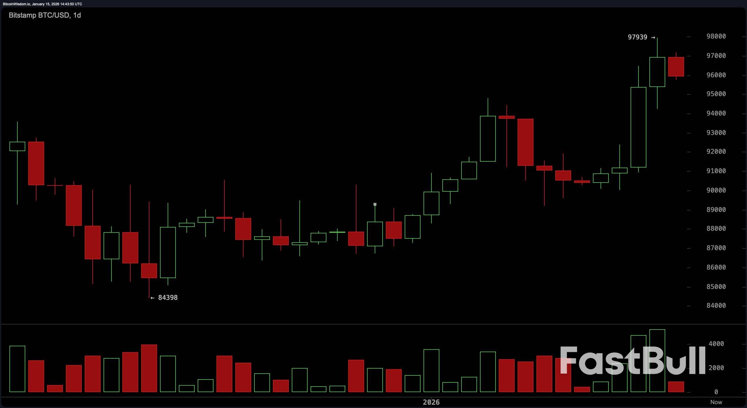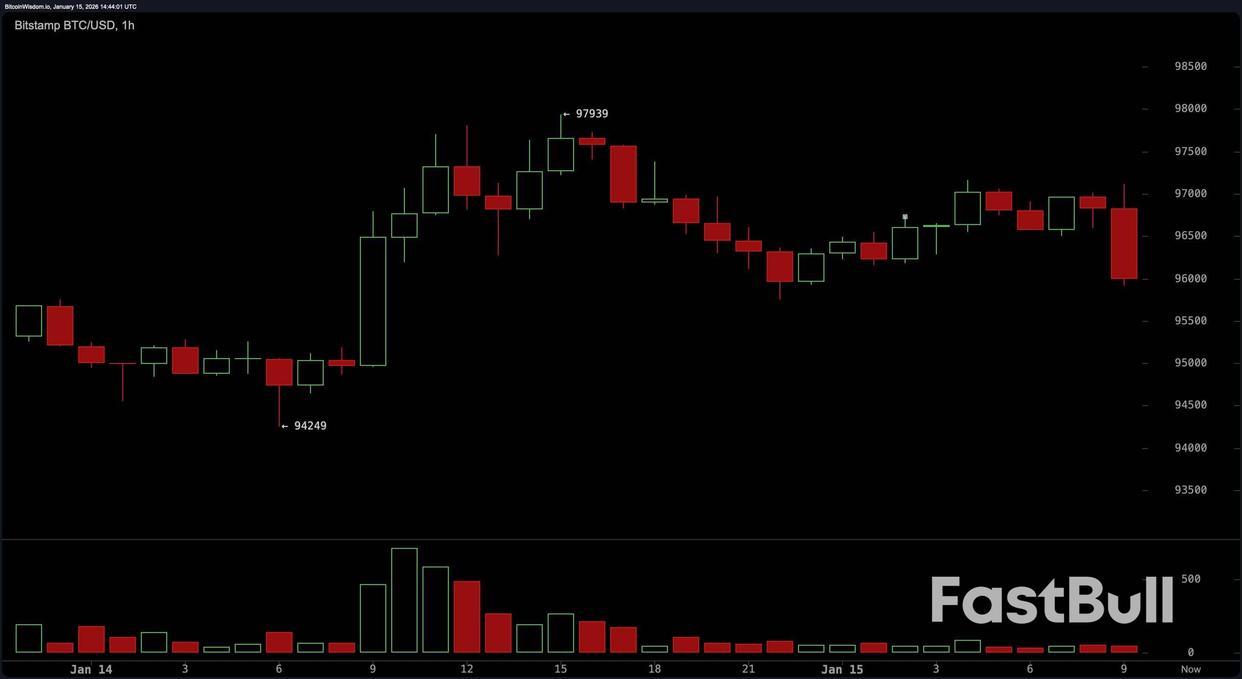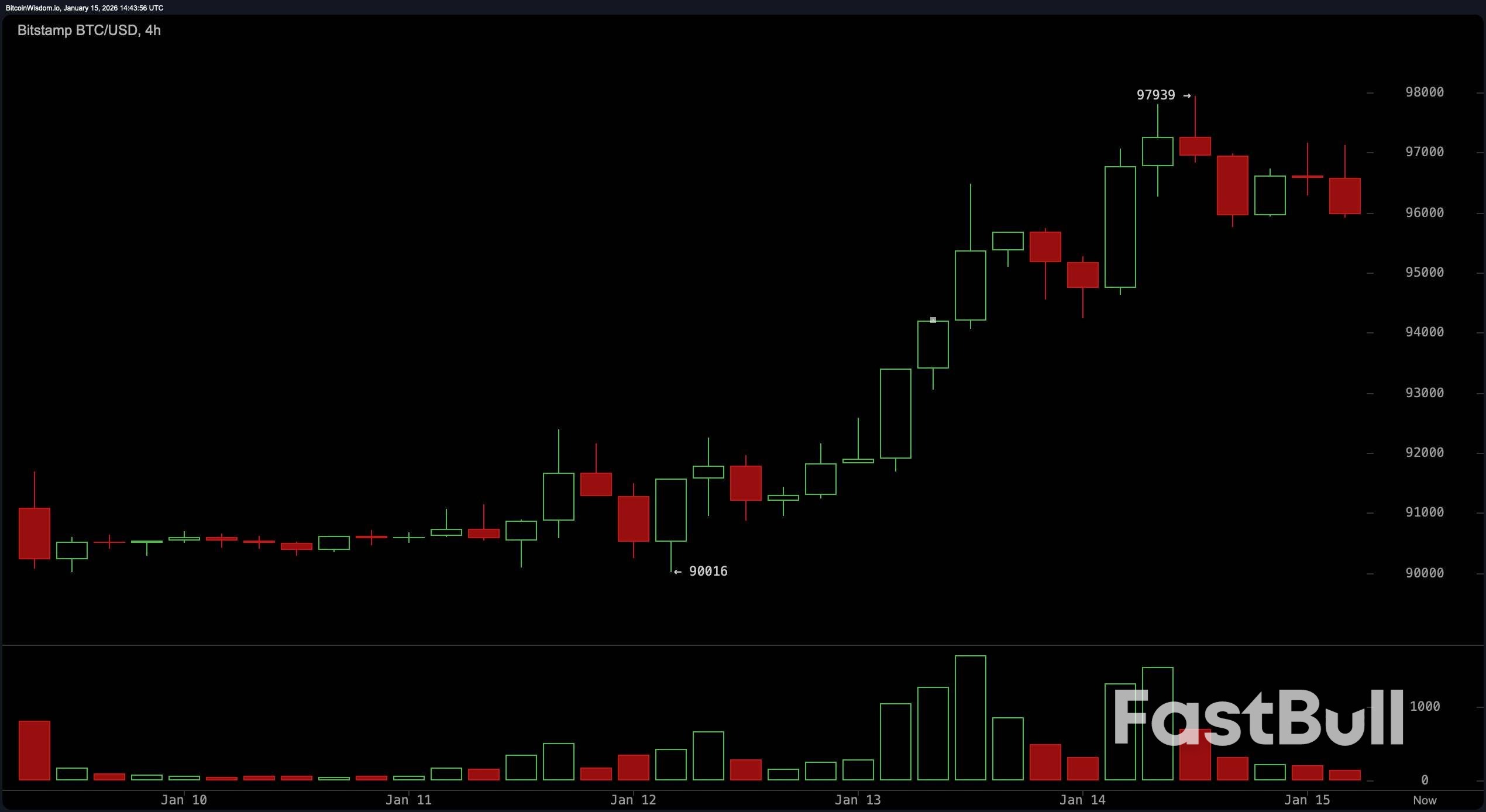 กราฟราคา BTC /USD ในระยะเวลา 4 ชั่วโมง จาก Bitstamp ณ วันที่ 15 มกราคม 2026สัญญาณระยะสั้นจากกราฟหนึ่งชั่วโมงเน้นการบีบอัดมากกว่าความมั่นใจ ราคาเคลื่อนไหวในกรอบแคบๆ ด้วยปริมาณการซื้อขาย ที่ลดลง บ่งชี้ถึงโมเมนตัมที่ลดลงหลังจากที่พุ่งสูงขึ้นก่อนหน้านี้ โครงสร้างคล้ายกับกรอบการรวมตัว โดยมี 96,500 ดอลลาร์เป็นจุดเปลี่ยนระยะสั้น หากอ่อนตัวลงต่ำกว่าระดับนั้น จะทำให้เกิดแรงกดดันลงภายในกรอบราคา ในทางกลับกัน หากราคาแข็งแกร่งขึ้นเหนือ 97,200 ดอลลาร์ จะส่งสัญญาณว่าผู้เข้าร่วมระยะสั้นกำลังกลับเข้ามามีส่วนร่วมอีกครั้ง แม้ว่าการยืนยันจะต้องอาศัยปริมาณการซื้อขายที่กลับมาอย่างแข็งแกร่งก็ตาม