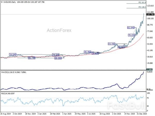 ราคาสินเงินยังคงพุ่งขึ้นอย่างรวดเร็วในวันนี้โดยไม่ลังเล ทะลุระดับ 100 ซึ่งเป็นระดับทางจิตวิทยา แนวโน้มระยะสั้นยังคงเป็นขาขึ้นตราบใดที่แนวรับที่ 99.34 ยังคงอยู่ เป้าหมายต่อไปคือการคาดการณ์ 138.2% จาก 48.60 เป็น 83.94 จาก 70.03 ที่ 118.86 ในทางกลับกัน หากราคาหลุดต่ำกว่า 99.34 จะบ่งชี้ถึงจุดสูงสุดในระยะสั้นและจะนำไปสู่การปรับฐานก่อน