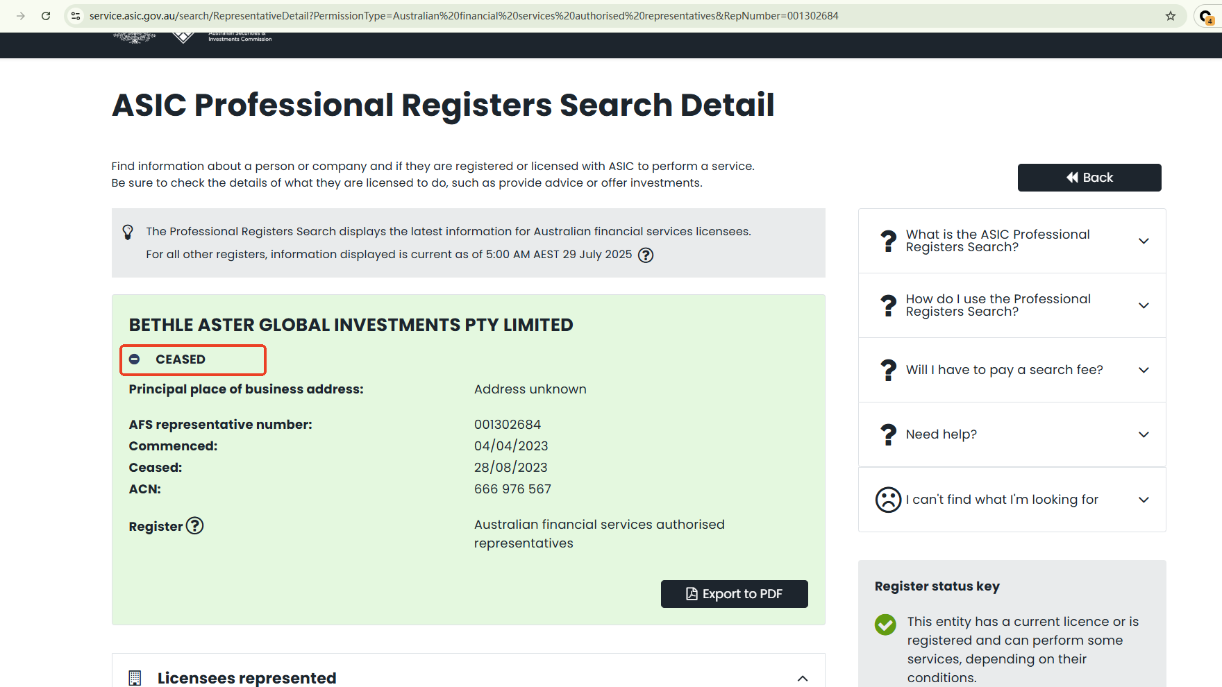 ANSWER BethleAsterFX is operated by Bethle Aster Global Investments Pty Limited, an Australian Financial Services Representative. Due to the absence of authentication details and domain for investors to verify, BethleAsterFX carries certain risks despite being authorized by a licensee regulated by the Australian Securities and Investments Commission (ASIC). Please beware of the risks involved.The reason why you need to exercise extreme caution when dealing with BethleAsterFX is that the limited information provided by the ASIC restricted you from verifying the ownership of website https://blafx.com. A lot of cases have suggested that some shady brokers would exploit details of real companies to appear legitimate. Therefore, there is no guarantee that the ASIC-registered company, Bethle Aster Global Investments Pty Limited, is the one offering financial services/products through the trading name BethleAsterFX at https://blafx.com.Additionally, while BethleAsterFX provides registration information with Vanuatu Financial Services Commission (VFSC), our search for this company in the VFSC's Financial Dealers Licensee List didn't yield any matching results. This means it is not authorized by the Vanuatu's Financial watchdog.Moving to the MSB number issued by the Financial Crimes Enforcement Network (FinCEN). As per US law, FinCEN's mission is to enhance U.S. national security, deter and detect criminal activity, and safeguard financial systems from abuse by promoting transparency in the U.S. and international financial systems. As a result, the MSB license cannot be considered as a financial license. BethleAsterFX, as a forex broker having an office in the US, is required to be regulated by the Commodity Futures Trading Commission (CFTC) and the National Futures Association (NFA). Therefore, it must be an NFA member first. However, data from the NFA suggest that it is a non-member and thus not subject to their oversight.In conclusion, engaging with BethleAsterFX could be risky, as it is not strictly regulated. Although we can temporarily say that it is legitimate, we strongly suggest you reconsider its reliability. We recommend choosing a fully regulated broker to start your trading life.