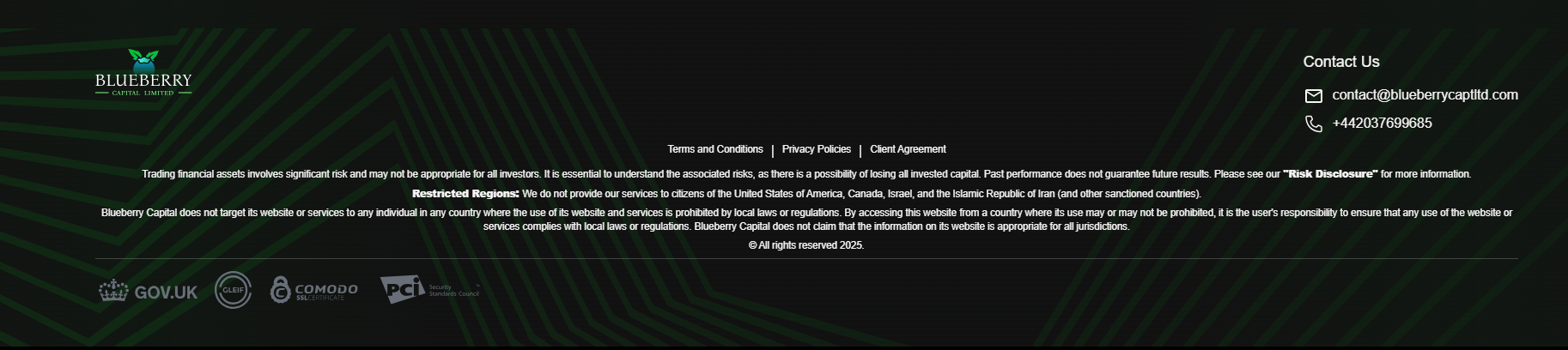 The absence of fundamental corporate details and regulatory authorization strongly indicates that Blueberry Capital operates without legal oversight and may lack a genuine physical presence altogether. These are common red flags associated with scam brokers designed to deceive investors.