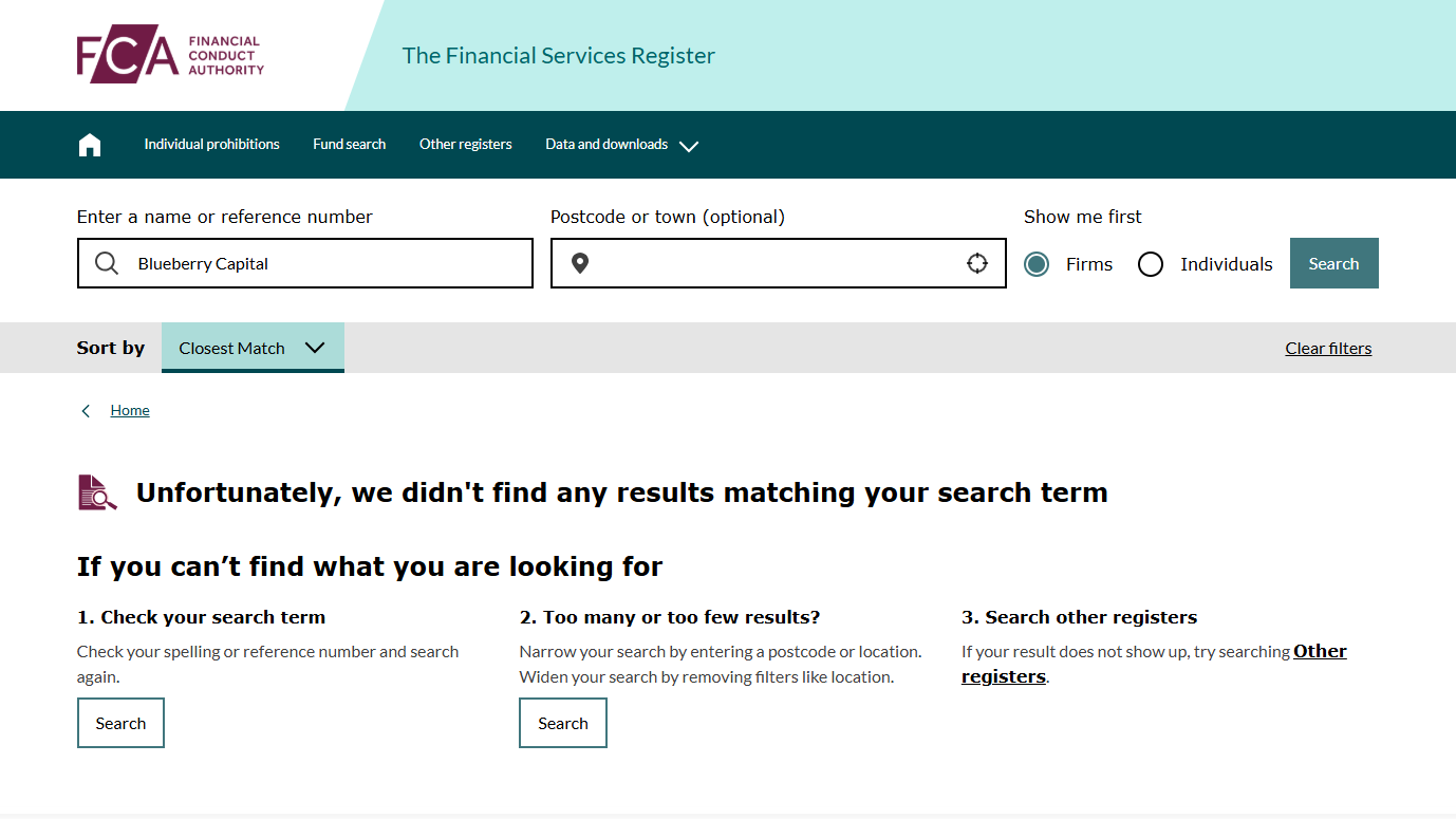 Its website discloses no verifiable regulatory information or registered business address—only a UK phone number is provided. In response, we conducted a thorough search of the UK Financial Conduct Authority (FCA) register, but found no listing for Blueberry Capital or any affiliated entity.