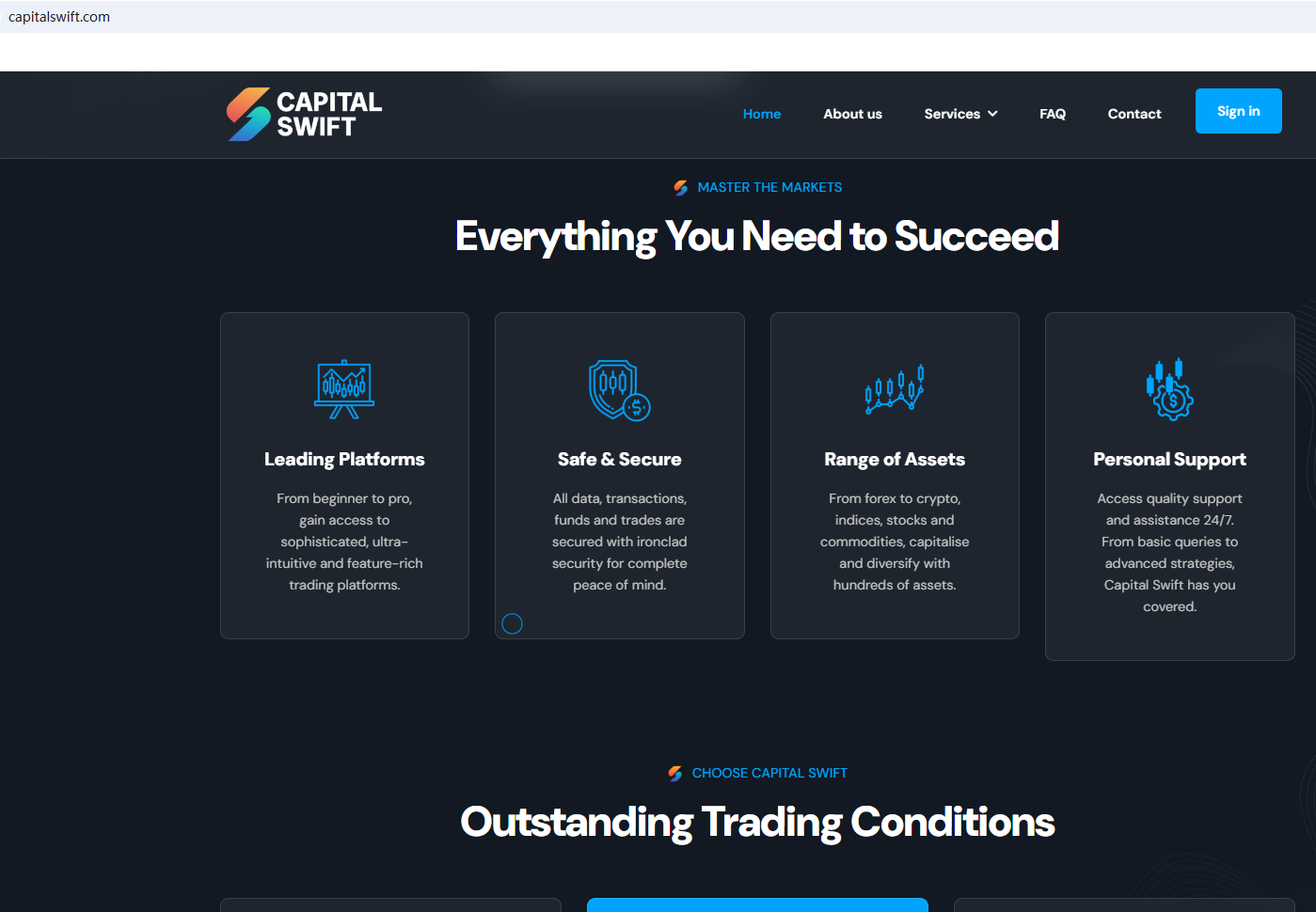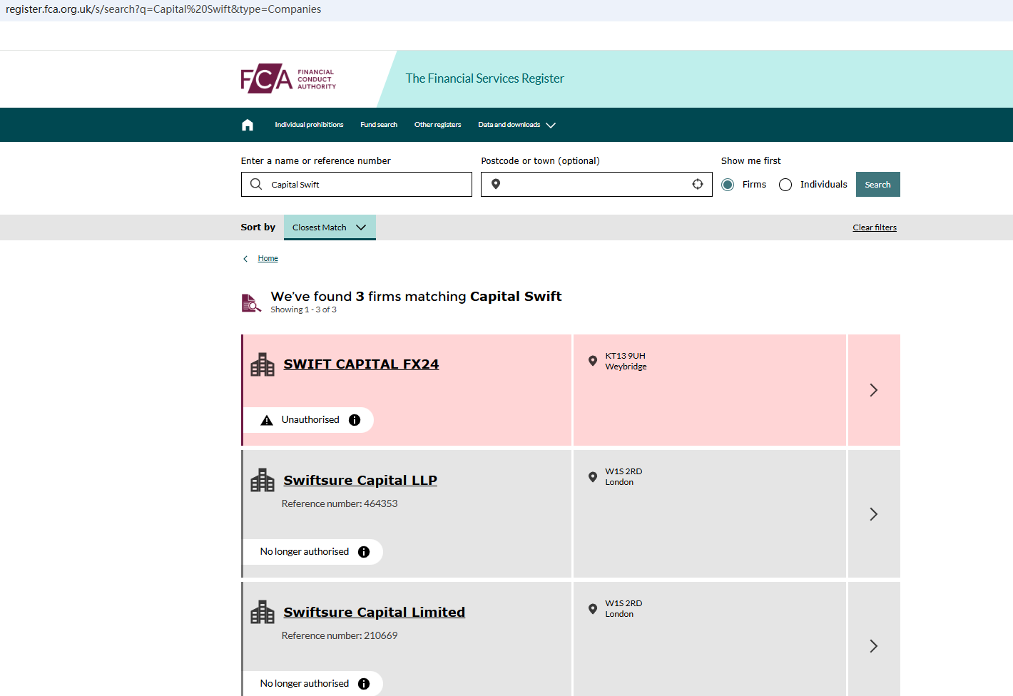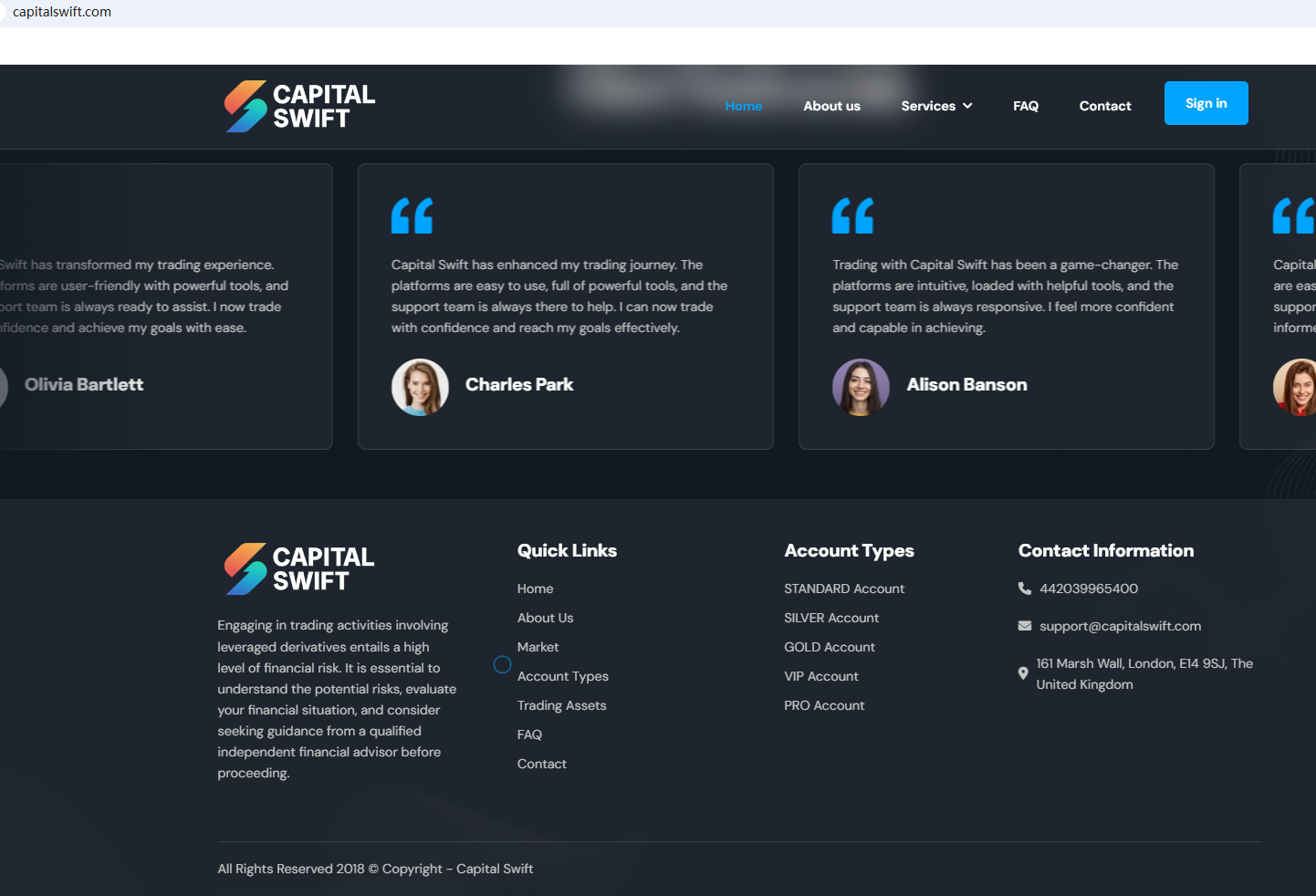 根據其網站信息,該公司位於英國。經調查,英國金融行為監理局(FCA)未找到與其相符的資訊。此外,澳洲證券與投資委員會(ASIC)也對Capital Swift發出警告,認為該公司可能在未獲得適當授權的情況下提供金融服務或產品。