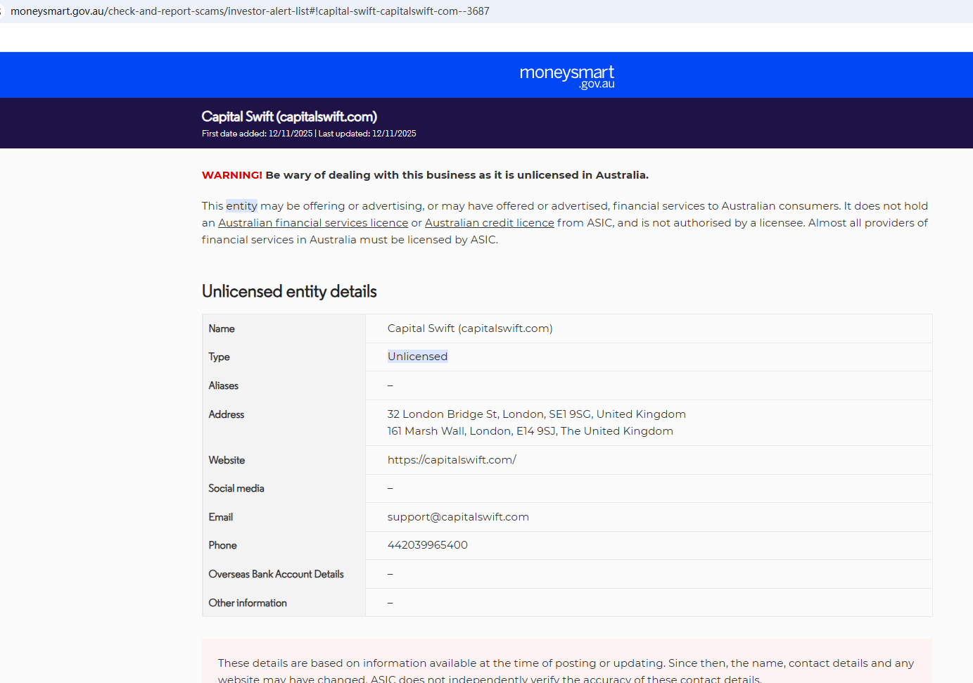 2025年11月12日,澳洲證券與投資委員會(ASIC)發布警告,指出Capital Swift公司可能在未獲得適當授權的情況下提供金融服務或產品。 https ://moneysmart.gov.au/check-and-report-scams/investor-alert-list#! capital-swift-capitalswift-com--3687