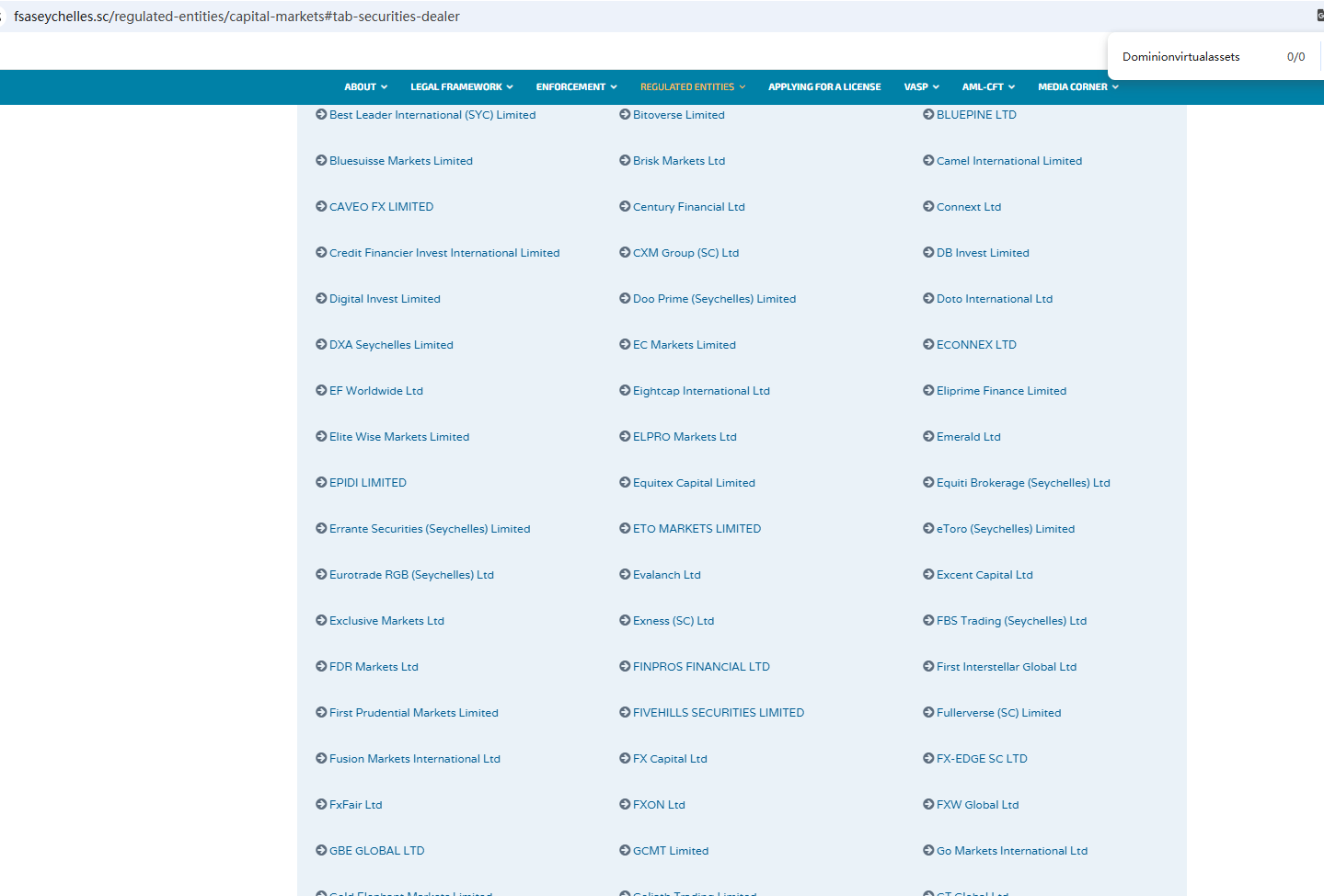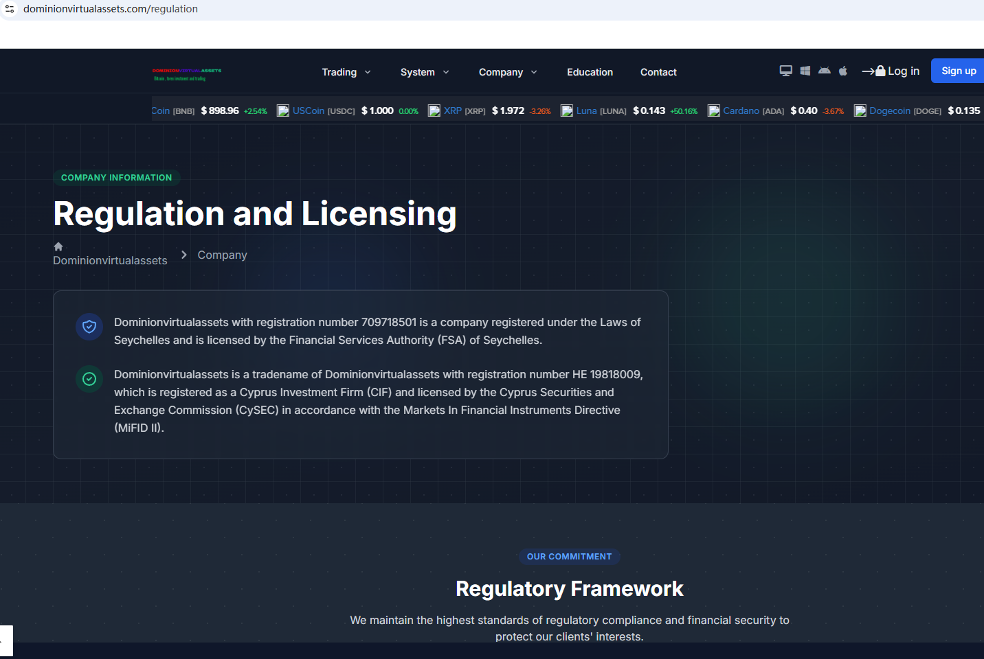 根據其網站訊息,該公司聲稱受塞席爾金融服務管理局 (Seychelles FSA) 和塞浦路斯證券交易委員會 (CySEC) 監管。經調查,在塞席爾金融服務管理局和塞浦路斯證券交易委員會的記錄中均未找到匹配資訊。此外,英國金融行為監理局 (FCA) 也對 Dominionvirtualassets 發出警告,懷疑該公司可能在未獲得必要授權的情況下提供金融服務或產品。