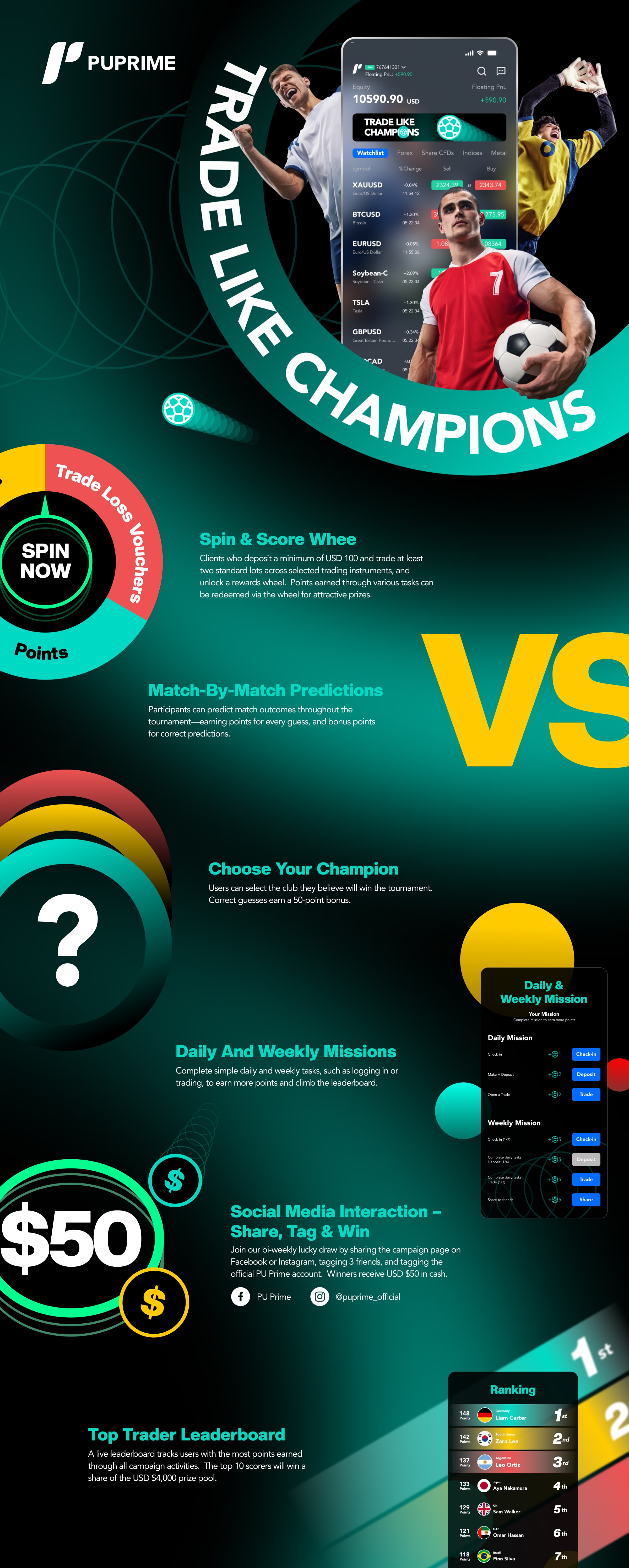 PU Prime’s Trade Like Champions promotion combines football-inspired challenges with engaging trading activities for users worldwide. From predicting match results and selecting champion clubs to completing daily missions and spinning the reward wheel, participants accumulate points across various in-app challenges. The top 10 players will divide a USD 4,000 prize pool, with additional surprise rewards available.