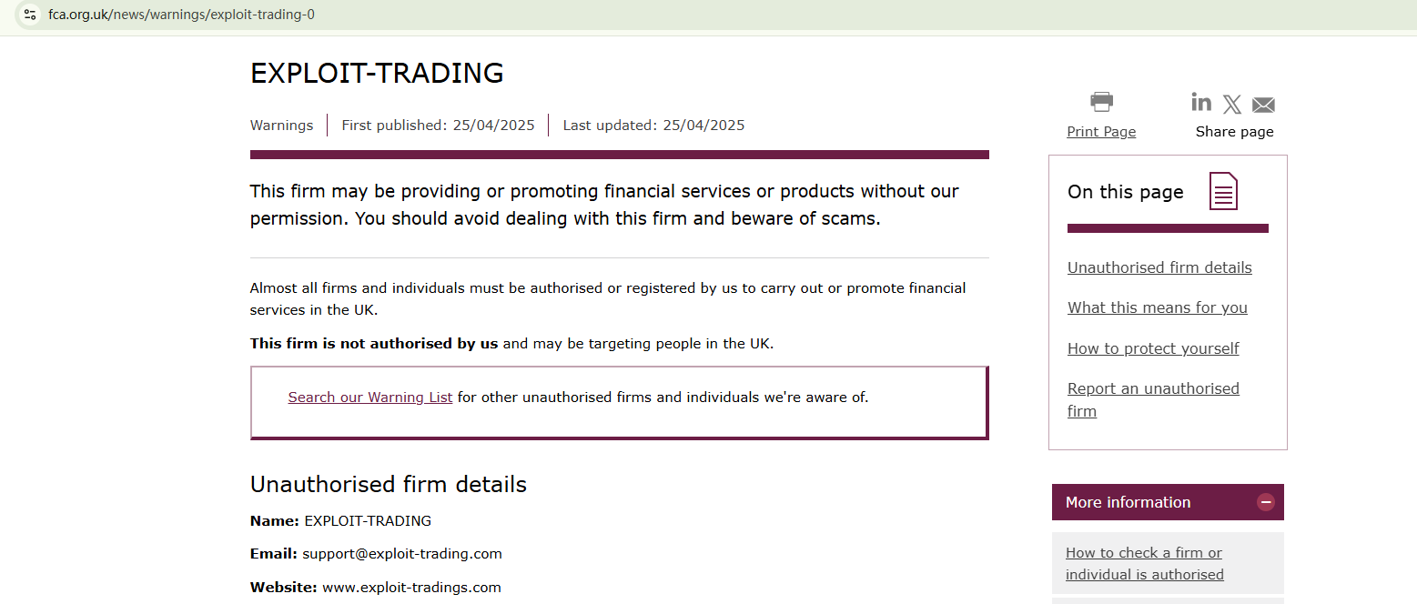 • 2025-04-24 FCA 針對Exploit Trading發出警告