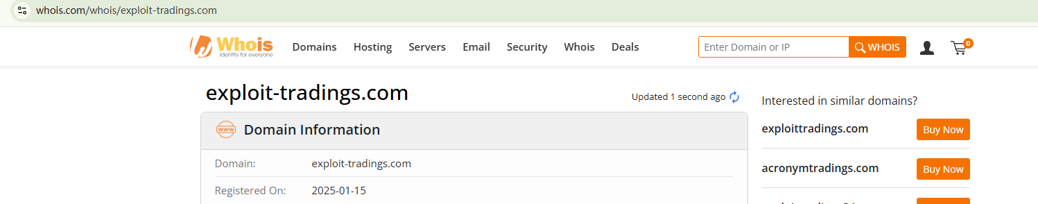 儘管 Exploit Trading 聲稱成立於 2021 年,但其網域直到 2025 年 1 月才註冊。這種明顯的差異引發了人們對該平台可信度和真實性的嚴重擔憂。